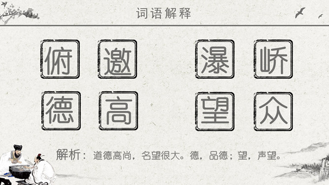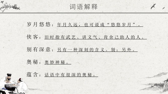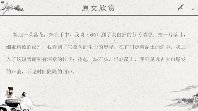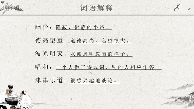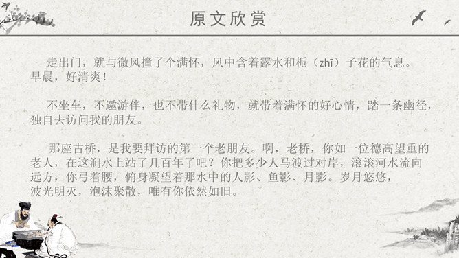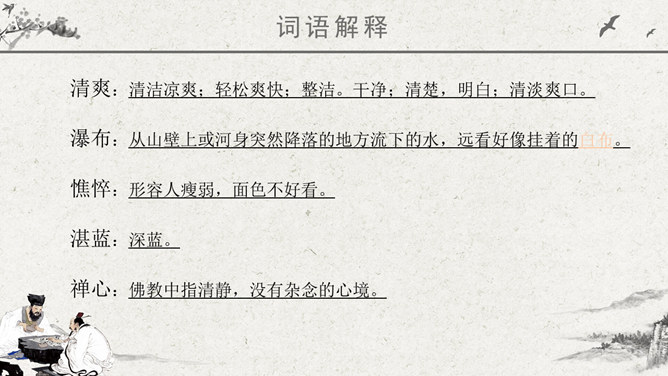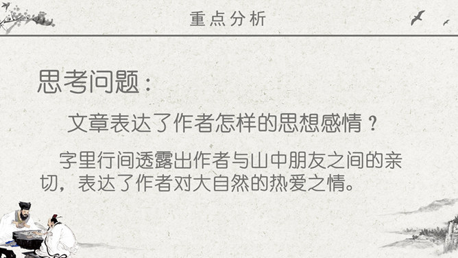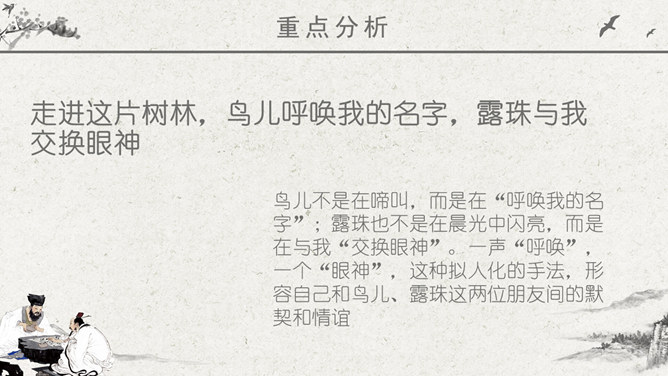 波光明灭:水波忽明忽暗的样子。唱和:一个人做了诗或词,别的人相应作答。侠客:旧时指有武艺、讲义气、肯舍己助人的人。瀑布:从山壁上或河身突然降落的地方流下的水,远看好像挂着的白布。思考问题:文章表达了作者怎样的思想感情?字里行间透露出作者与山中朋友之间的亲切,表达了作者对大自然的热爱之情。鸟儿不是在啼叫,而是在“呼唤我的名字”;露珠也不是在晨光中闪亮,而是在与我“交换眼神”。一声“呼唤”,一个“眼神”,这种拟人化的手法,形容自己和鸟儿、露珠这两位朋友间的默契和情谊。把“老桥”比喻成“一位德高望重的老人”,不但写了桥的古老,而且也突出了它默默无闻的为大众服务的品质,充分表达了作者对老桥的赞美和敬佩。熟读本文,体会作者“带着满怀的好心情”走进山林,进山看了一路的美景,可作者为什么却说成“山中访友”呢?