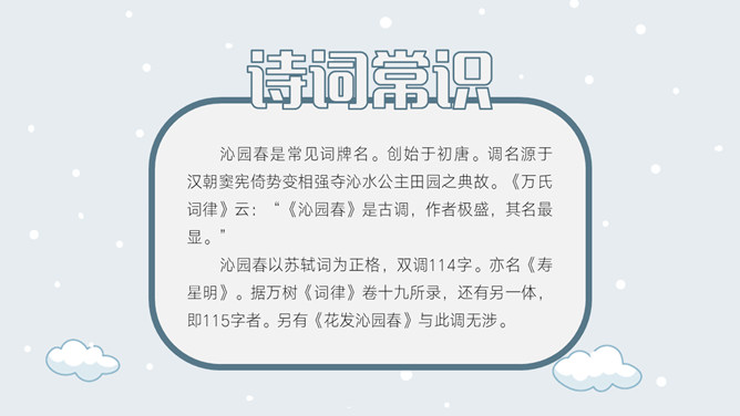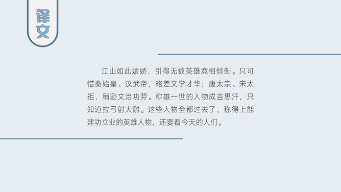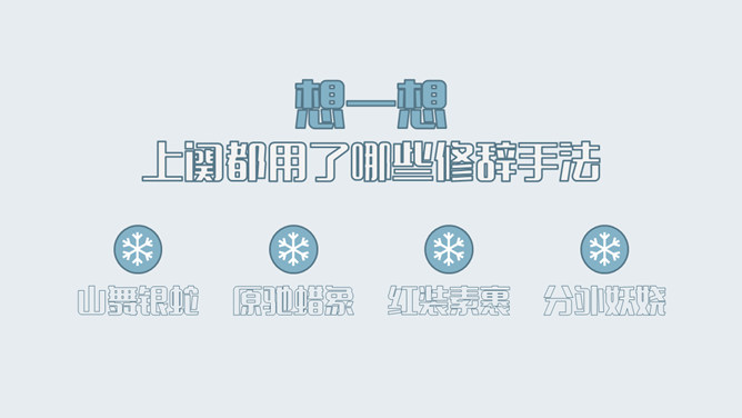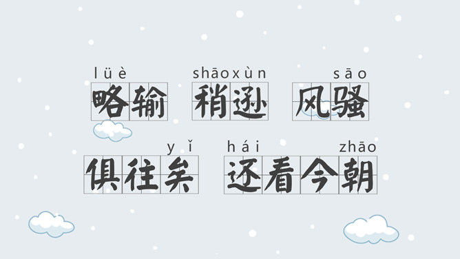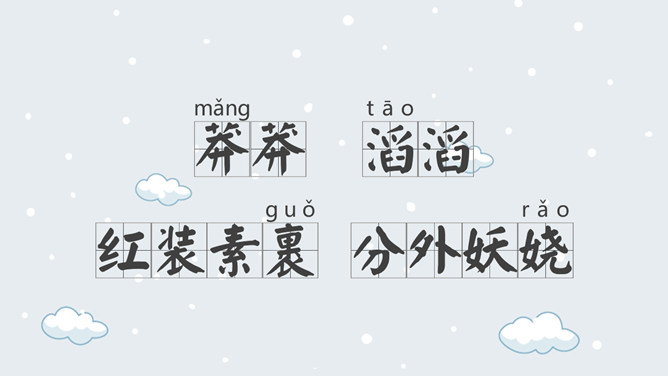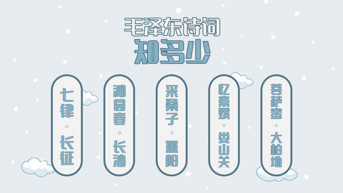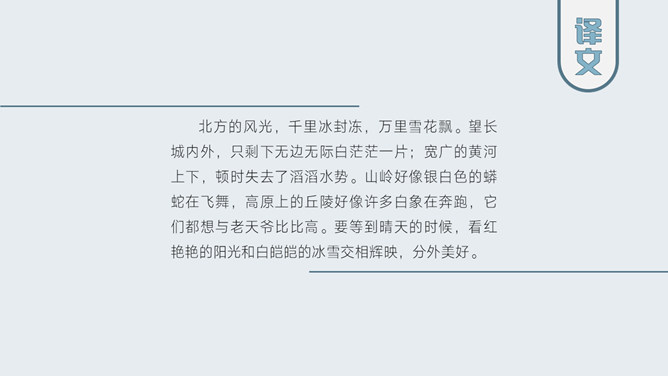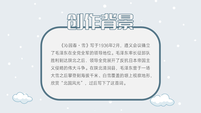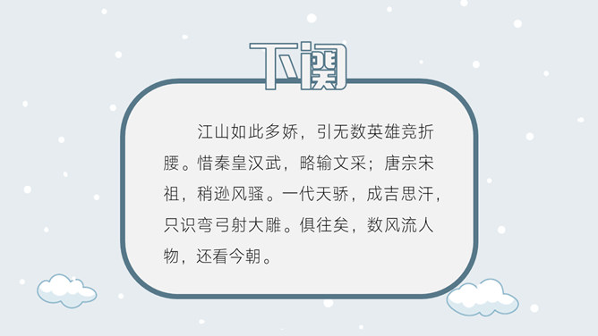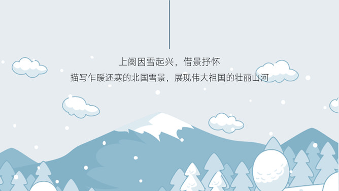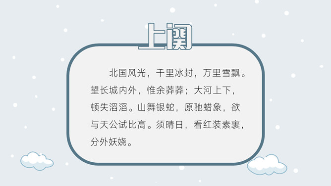上阕因雪起兴,借景抒怀,描写乍暖还寒的北国雪景,展现伟大祖国的壮丽山河。下阕由毛主席对祖国山河的壮丽而感叹,引出秦皇汉武等英雄人物,抒发作者的伟大抱负。全篇用字遣词,设喻用典,明快有力,挥洒自如,辞义畅达,一泻千里。毛主席讲究词章格律,但又不刻意追求。全词合律入韵,似无意而为之。虽属旧体却给人以面貌一新之感。不单是从词境中表达出的新的精神世界,而首先是意象表达系统的词语,鲜活生动,凝练通俗,易诵易唱易记。还有哪些描写雪景的文学作品?试着用自己的语言描述雪景。选择一位你熟悉的中国古代帝王,向大家介绍一下他的故事。有感情地朗读并背诵全文。所属专题:沁园春雪ppt。