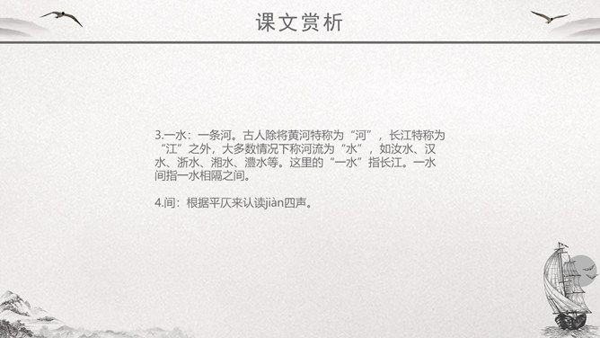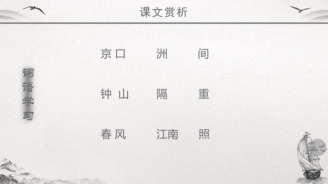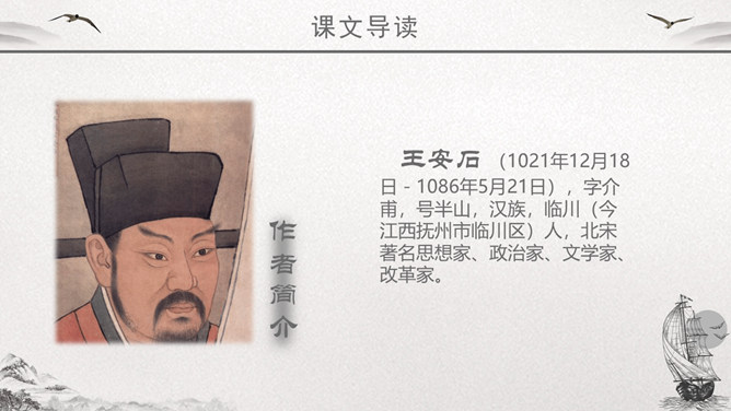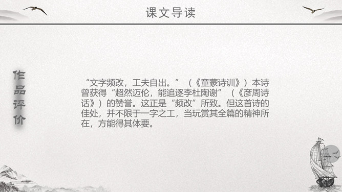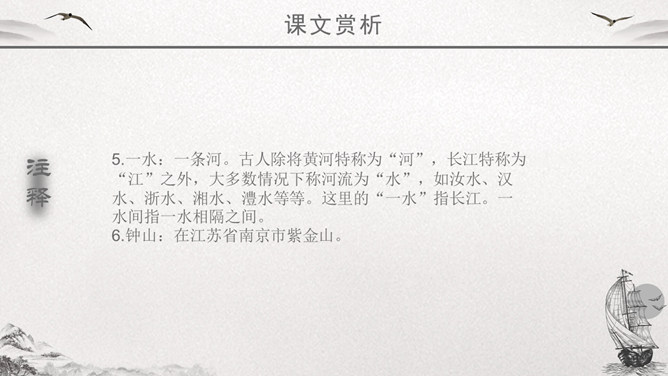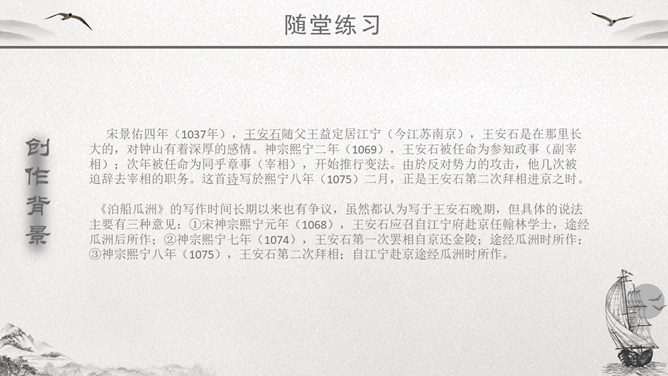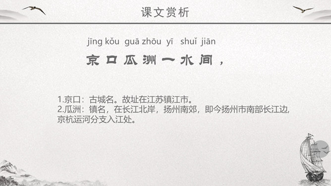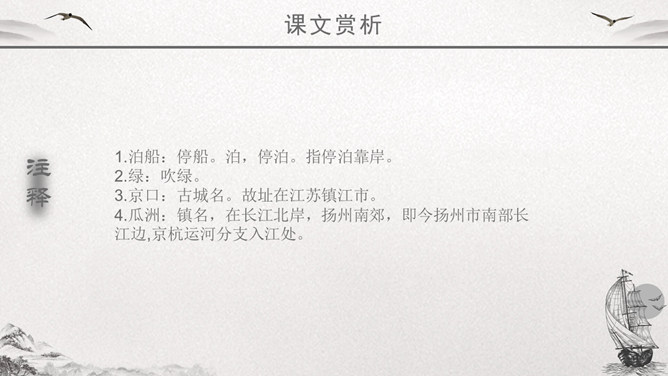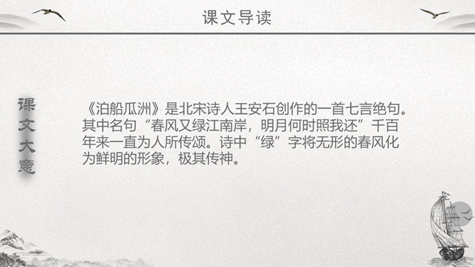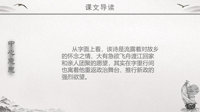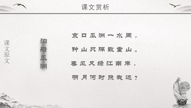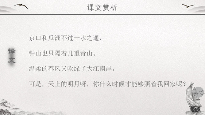从字面上看,该诗是流露着对故乡的怀念之情,大有急欲飞舟渡江回家和亲人团聚的愿望,其实在字里行间也寓着他重返政治舞台、推行新政的强烈欲望。“文字频改,工夫自出。”(《童蒙诗训》)本诗曾获得“超然迈伦,能追逐李杜陶谢”(《彦周诗话》)的赞誉。这正是“频改”所致。但这首诗的佳处,并不限于一字之工,当玩赏其全篇的精神所在,方能得其体要。思考与讨论:面对明月,你还能想起哪些思乡诗?所属专题:泊船瓜洲ppt。