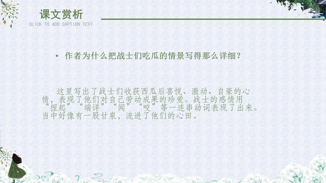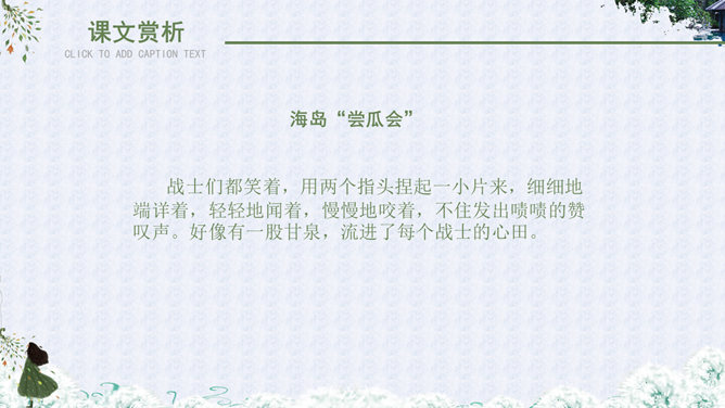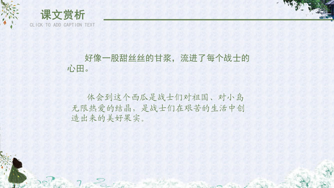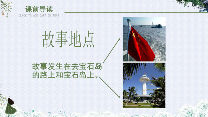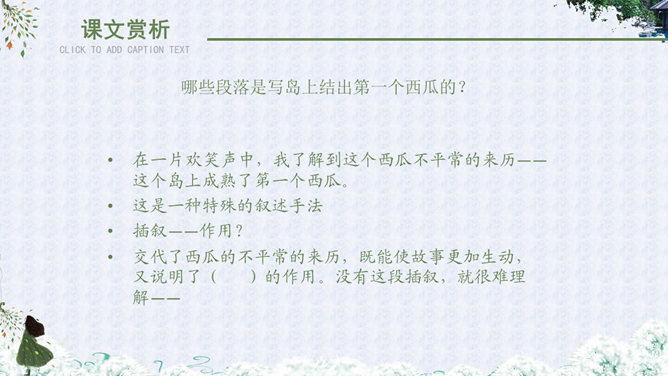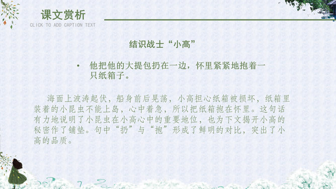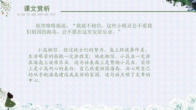 自读课文,理解大意:故事发生在什么地方?课文主要讲述了哪几件事?故事地点:故事发生在去宝石岛的路上和宝石岛上。海面上波涛起伏,船身前后晃荡,小高担心纸箱被损坏,纸箱里装着的小昆虫不能上岛,心中着急,所以把纸箱抱在怀里。这句话有力地说明了小昆虫在小高心中的重要地位,也为下文揭开小高的秘密作了铺垫。句中“扔”与“抱”形成了鲜明的对比,突出了小高的品质。小高相信,经过战士们的努力,岛上环境条件差、生活艰苦的面貌一定会改变;他也相信,小昆虫一定会在海岛上安居乐业。这句话表面上是赞扬小昆虫,实际上是小高内心的表白:自己热爱祖国海岛,决心用自己的双手把海岛建设成美丽的家园。这句话点明了文章的中心。作者为什么把战士们吃瓜的情景写得那么详细?这里写出了战士们收获西瓜后喜悦、激动、自豪的心情,表现了他们对自己劳动成果的珍爱。战士的感情用“捏起”“端详”“闻”“咬”等一连串动词表现了出来。当中好像有一股甘泉,流进了他们的心田。