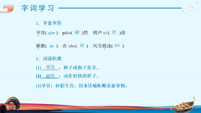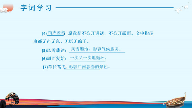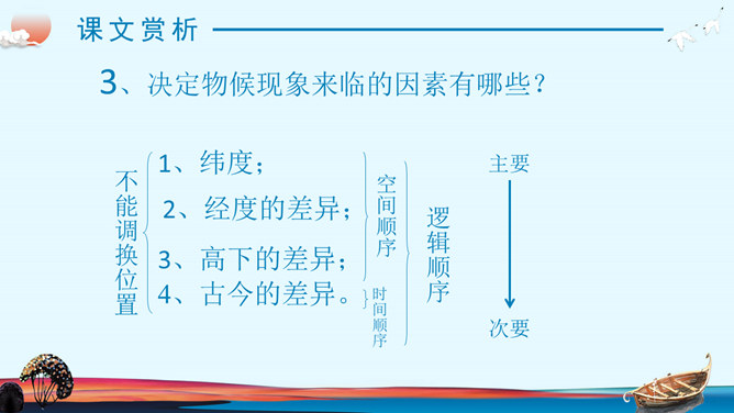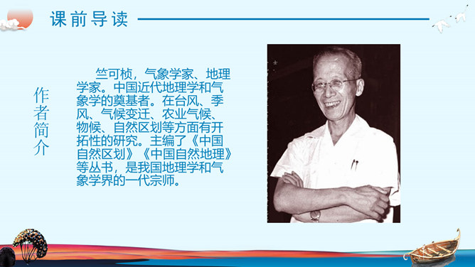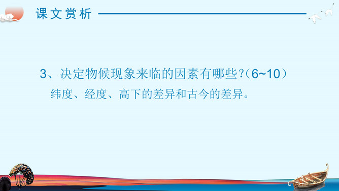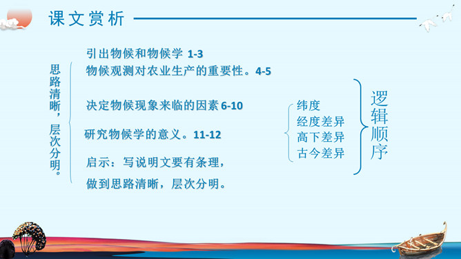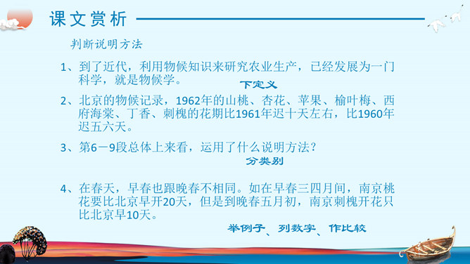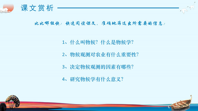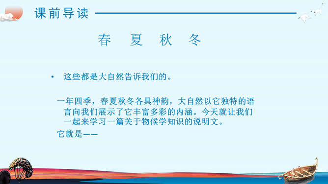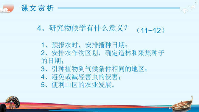 一年四季,春夏秋冬各具神韵,大自然以它独特的语言向我们展示了它丰富多彩的内涵。今天就让我们一起来学习一篇关于物候学知识的说明文。比比哪组快:快速阅读课文,准确地筛选出所需要的信息:1、什么叫物候?什么是物候学?2、物候观测对农业有什么重要性?3、决定物候观测的因素有哪些?4、研究物候学有什么意义?什么叫物候和物候学?草木荣枯、候鸟去来等自然现象,古代劳动人民称之为物候;利用物候来研究农业生产的科学叫物候学。 决定物候现象来临的因素有哪些?纬度、经度、高下的差异和古今的差异。 如在早春三四月间,南京桃花要比北京早开20天,但是到晚春五月初,南京刺槐开花只比北京早10天。所以在华北常感觉到春季短促,冬天结束,夏天就到了。“只”“就”二字可删除吗?“大自然的语言” 指的是“物候现象”。这是比喻的说法,也把大自然拟人化了,显得新颖而有情趣,引起读者的好奇心和阅读兴趣。所属专题:大自然的语言ppt。