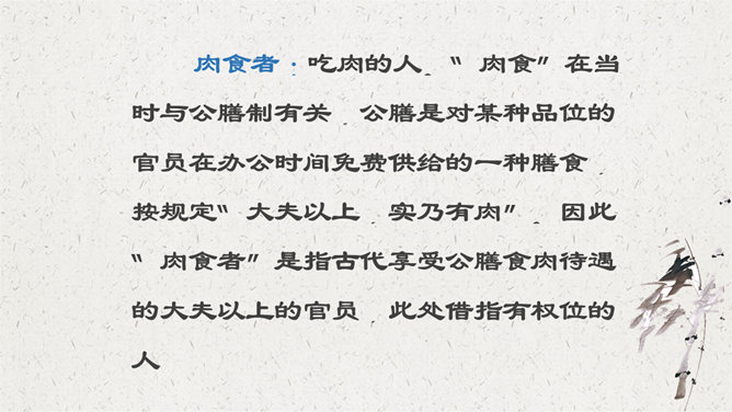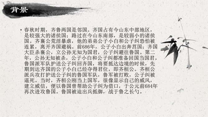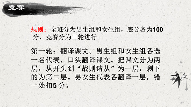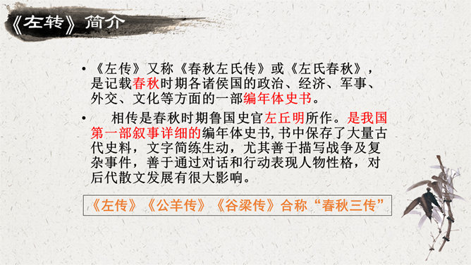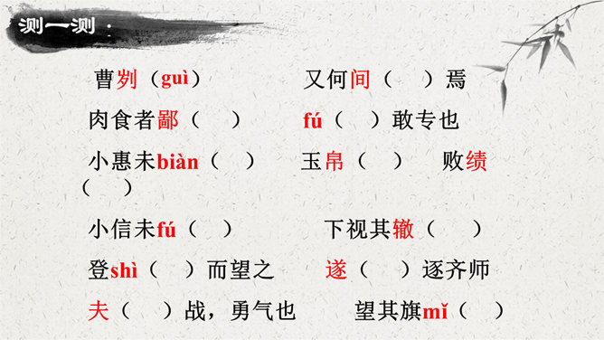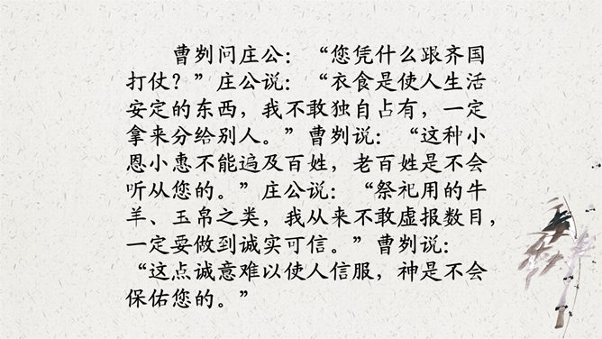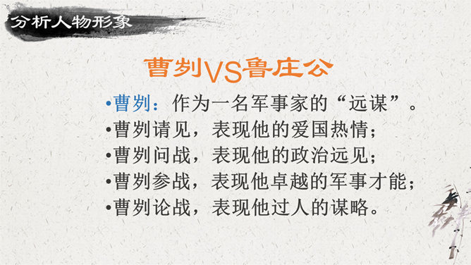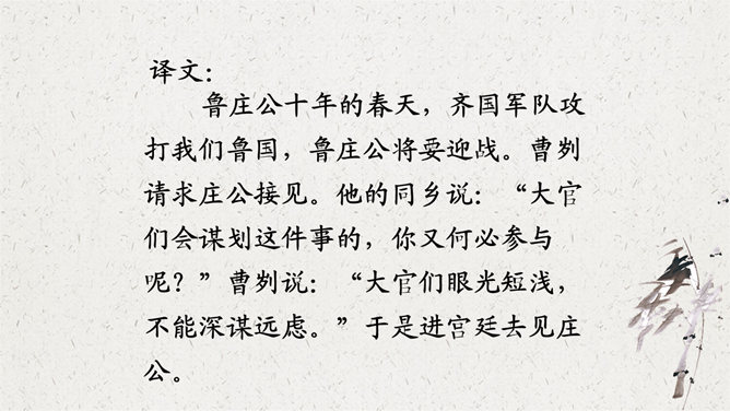《左传》又称《春秋左氏传》或《左氏春秋》,是记载春秋时期各诸侯国的政治、经济、军事、外交、文化等方面的一部编年体史书。同学们结成四人小组,参照注释,借助工具书,理解字词,翻译课文。第一轮:翻译课文。男生组和女生组各选 一名代表,口头翻译课文。把课文分为两层,从开头到“战则请从”为一层,剩下的为第二层。男女生代表各翻译一层,错一处扣5 分。1、你还知道历史上的哪些以少胜多、以弱胜强的战例?官渡之战、赤壁之战、淝水之战……2、找出与下面加点字意思相同的成语。本文通过写齐鲁长勺之战,论述了取信于民,运用正确的战略战术并掌握恰当的时机才能取得胜利的道理,生动刻画了曹刿作为卓越军事家富有远谋的特点,语言简练。所属专题:曹刿论战ppt。