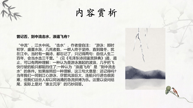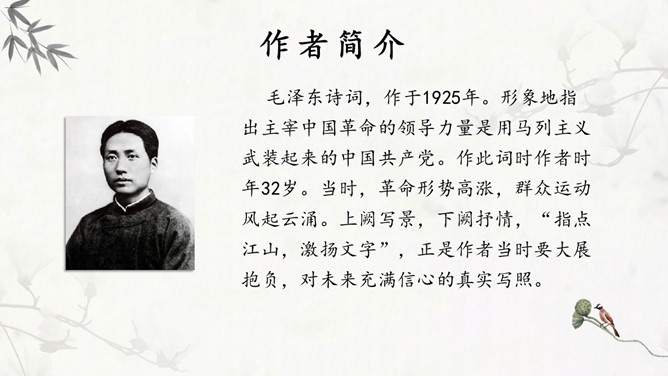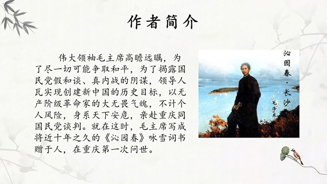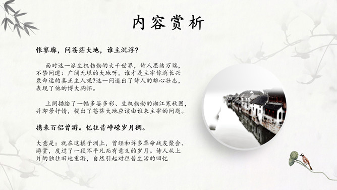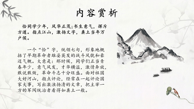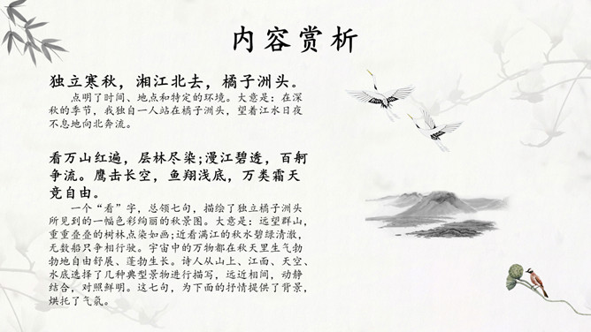 独立寒秋,湘江北去,橘子洲头。点明了时间、地点和特定的环境。大意是:在深秋的季节,我独自一人站在橘子洲头,望着江水日夜不息地向北奔流。看万山红遍,层林尽染;漫江碧透,百舸争流。鹰击长空,鱼翔浅底,万类霜天竞自由。一个“看”字,总领七句,描绘了独立橘子洲头所见到的一幅色彩绚丽的秋景图。大意是:远望群山,重重叠叠的树林点染如画;近看满江的秋水碧绿清澈,无数船只争相行驶。宇宙中的万物都在秋天里生气勃勃地自由舒展、蓬勃生长。诗人从山上、江面、天空、水底选择了几种典型景物进行描写,远近相间,动静结合,对照鲜明。这七句,为下面的抒情提供了背景,烘托了气氛。下阕回忆了往昔峥嵘岁月,表现了诗人和战友们为了改造旧中国英勇无畏的革命精神和壮志豪情,形象含蓄地给出了“谁主沉浮”的答案:主宰国家命运的,是以天下为己任、蔑视反动统治者、敢于改造旧世界的革命青年。毛主席在中国共产党的七大致开幕词时指出,抗战胜利后,“在中国人民面前摆着两条路,光明的路和黑暗的路。有两种中国之命运,光明的中国之命运与黑暗的中国之命运”。推动革命前进,建立一个独立、统一、富强的新中国;或者是听任反动派拉着中国倒退,恢复到半殖民地半封建的老路上去,这是一场严重的斗争。《沁园春》在此刻问世,好像夺亮的号角,召唤人们朝着解放的路上迅跑,去争取中国新民主主义革命最后胜利的光明前途。