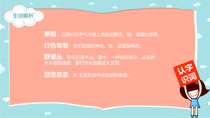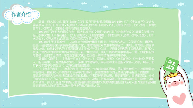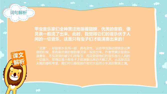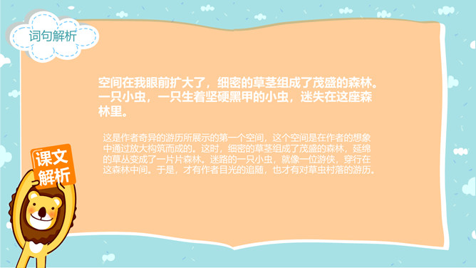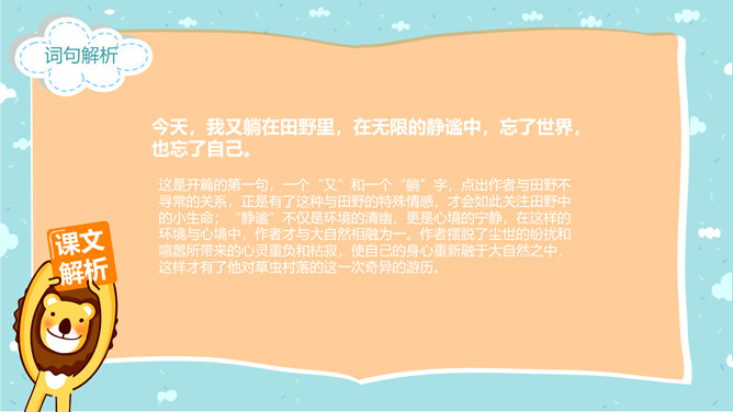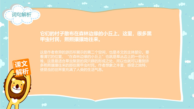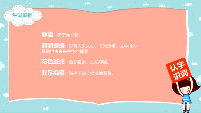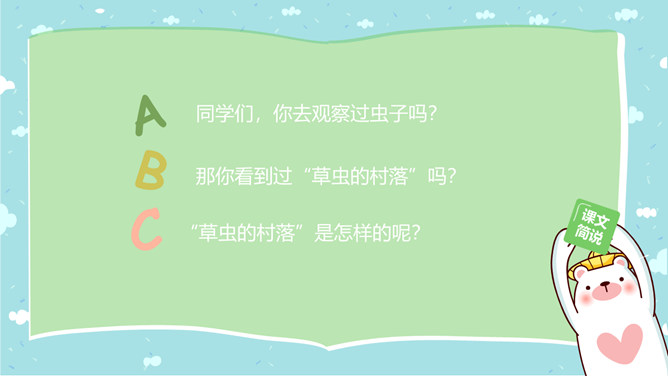 郭枫,原名郭少鸣, 现任《新地文学》双月刊社长兼总编辑.高中时代,他在《宝岛文艺》发表长篇叙事诗《北方》即倍受文坛瞩目.1950年起,他成为《半月文艺》,《中国文艺》,《大公报》,《时代青年》,《野风》,《宝岛》等刊物的主要撰稿人。同学们,你去观察过虫子吗?那你看到过“草虫的村落”吗?“草虫的村落”是怎样的呢?初读课文,整体感知:自由读课文,字词检查,交流反馈。静谧:安宁而平静。熙熙攘攘:形容人来人往,非常热闹。文中指的是黑甲虫来来往往的情景。花色斑斓:色彩艳丽,灿烂夺目。驻足痴望:指停下脚步痴痴地看着。这是开篇的第一句,一个“又”和一个“躺”字,点出作者与田野不寻常的关系,正是有了这种与田野的特殊情感,才会如此关注田野中的小生命;“静谧”不仅是环境的清幽,更是心境的宁静,在这样的环境与心境中,作者才与大自然相融为一。作者摆脱了尘世的纷扰和喧嚣所带来的心灵重负和枯寂,使自己的身心重新融于大自然之中,这样才有了他对草虫村落的这一次奇异的游历。