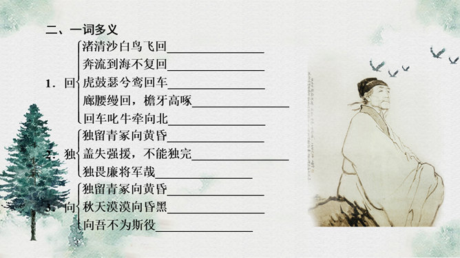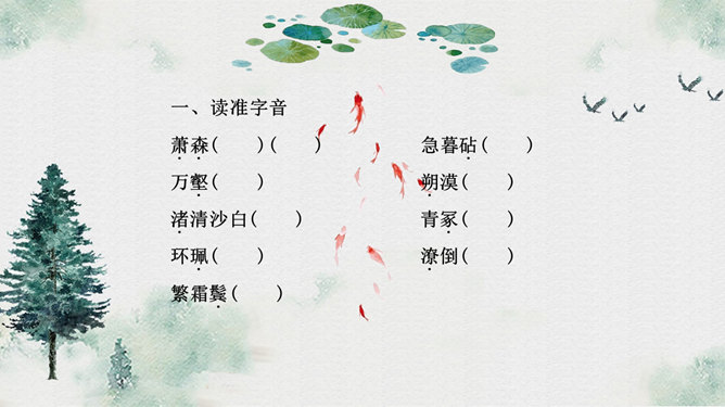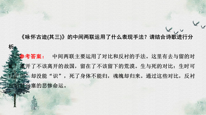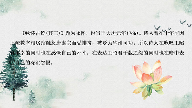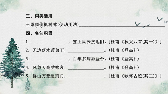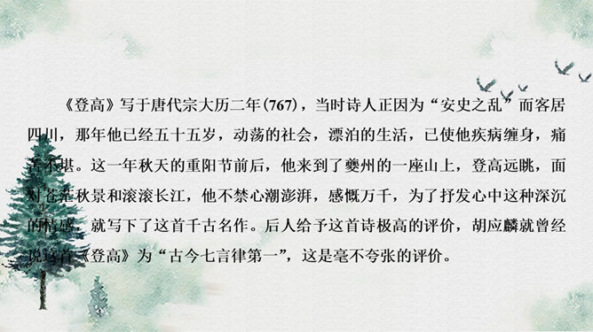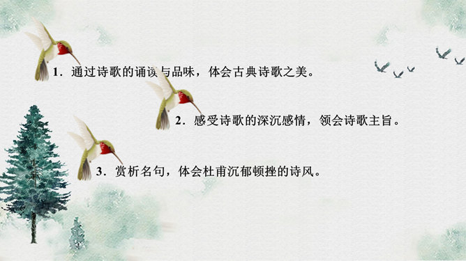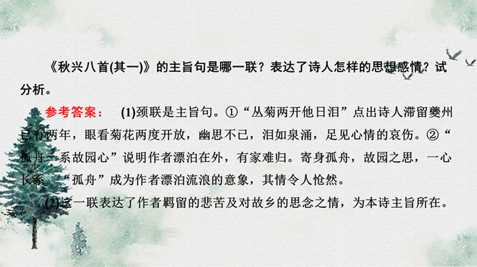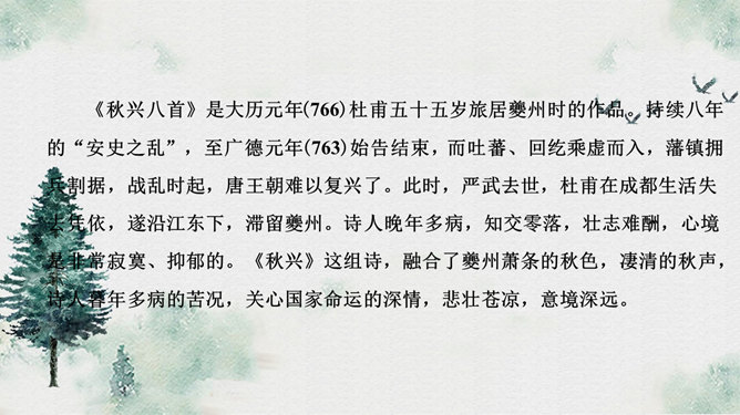 通过诗歌的诵读与品味,体会古典诗歌之美。感受诗歌的深沉感情,领会诗歌主旨。赏析名句,体会杜甫沉郁顿挫的诗风。《秋兴八首(其一)》是一篇随物兴感、即景寄怀之作。诗人通过对巫山、巫峡深秋景象的描绘,渲染了阴沉萧森、动乱不安的环境气氛,抒写了自己因离乱而常年流落他乡、不能东归中原的悲哀和对干戈不息、前途未卜的国家的担忧。《登高》通过重阳登高所见、所闻、所感,描绘了江边深渊空旷的景色,抒发了诗人常年漂泊、潦倒一生、老病孤愁的复杂情感。全诗情景交融,以描绘秋景作为外在的行文线索,以抒发悲秋之情作为连通各联的内在脉络,不仅是悲自然萧瑟之秋,更是悲人生之秋和国运衰落之秋,充溢着身世之感和家国之思,意境深闳,蕴含丰厚。