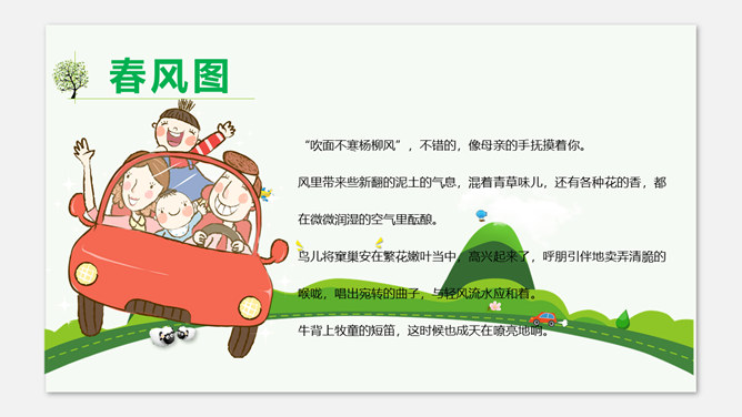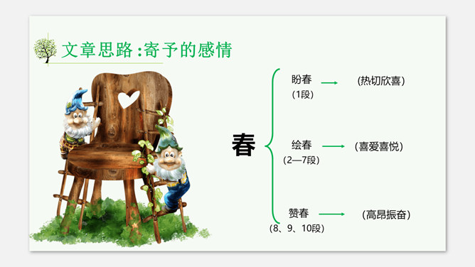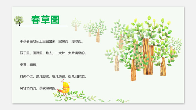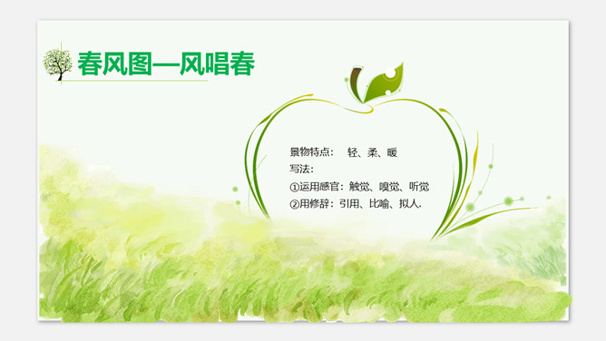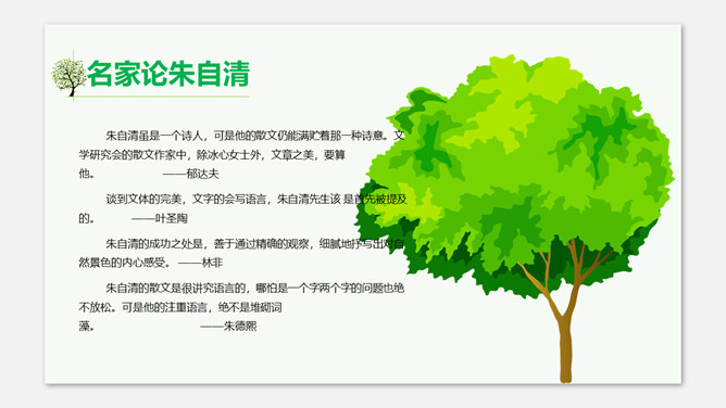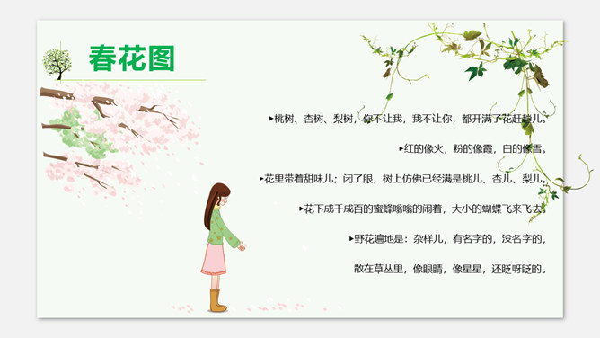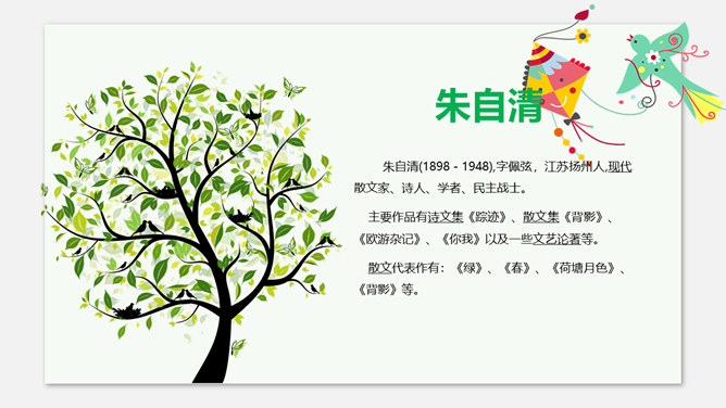 朱自清(1898-1948),字佩弦,江苏扬州人,现代散文家、诗人、学者、民主战士。景物特点:春花竞相开放,繁花似锦。写法:①写颜色。②用感官:视觉、嗅觉、听觉(味觉、触觉)。③用修辞:拟人、排比、比喻。④虚实结合:眼前现实——脑海中想象。⑤动静结合:花—蜜蜂蝴蝶。⑥正侧面描写相结合:花—虫。⑦方位顺序(空间顺序):树上—花下—地上。⑧明暗结合:像眼睛,像星星。《春》是一篇诗意盎然的写景抒情的散文。作者用发自内心的真挚情感,选取了春天到来时那些最富有特点也最能体现春天的新鲜、美好、生机和活力的画面,用优美诗意的语言,描写了春回大地的景象,表现了春天里自然万物勃发的生命力,表达了对春天、对生活的热爱。所属专题:春ppt。