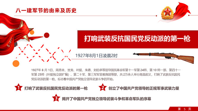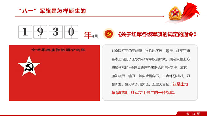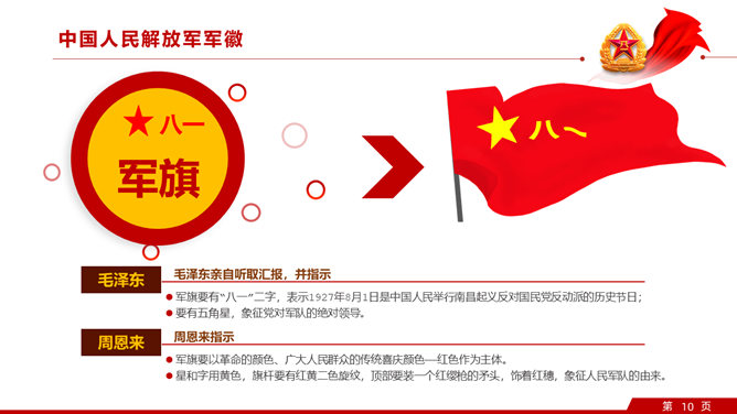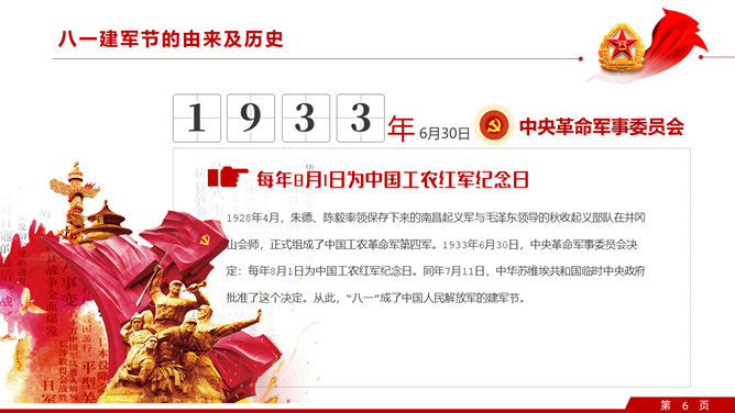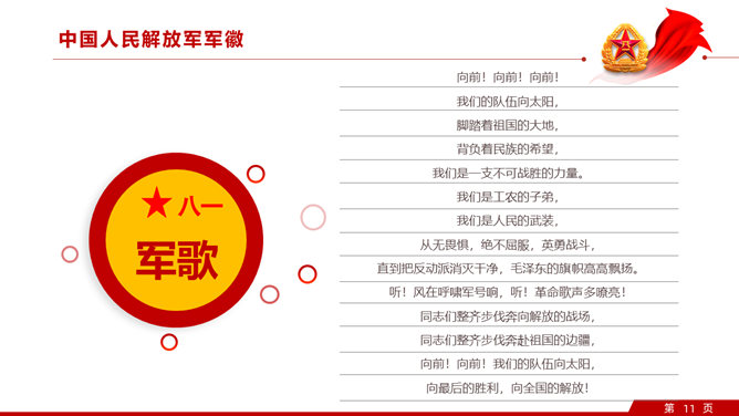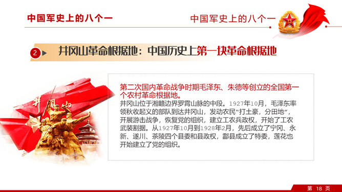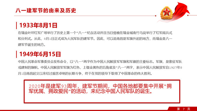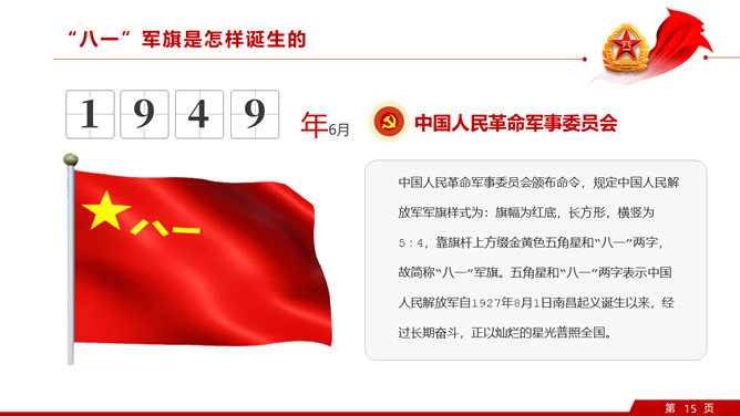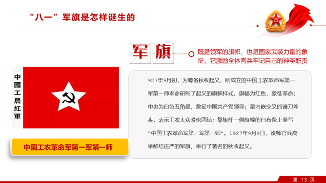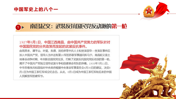 八一建军节军魂军史PPT模板。一套八一建军节主题幻灯片模板,同样适合解放军军史介绍讲解课件使用。