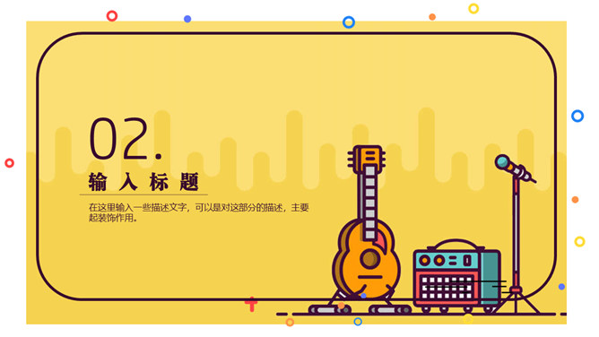 MBE风吉他音乐培训PPT模板。一套音乐主题相关幻灯片模板,吉他话筒音箱背景,清新可爱MBE风格设计。