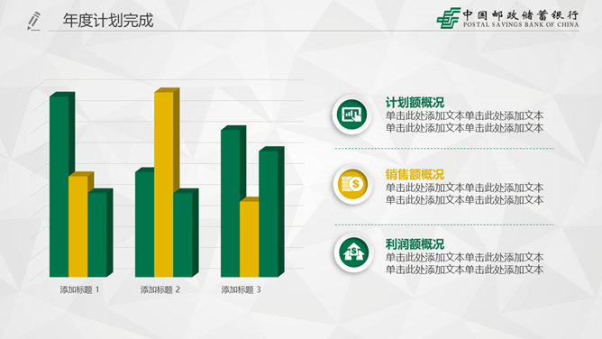 中国邮政储蓄银行专用PPT模板。一套中国邮政储蓄银行专用工作总结计划汇报幻灯片模板,微粒体视觉效果,页面丰富实用。