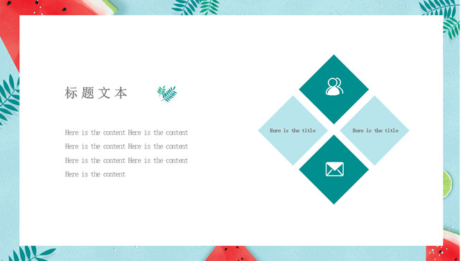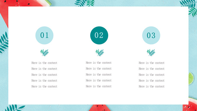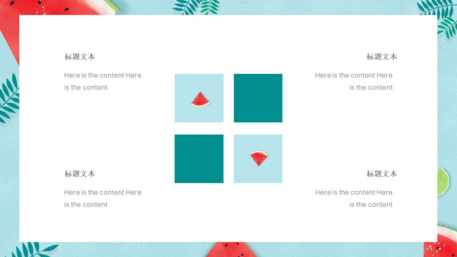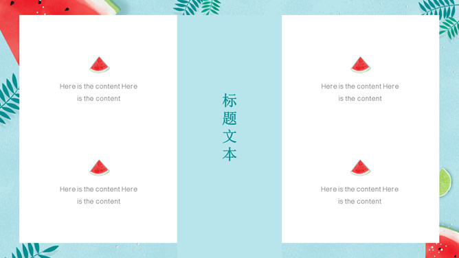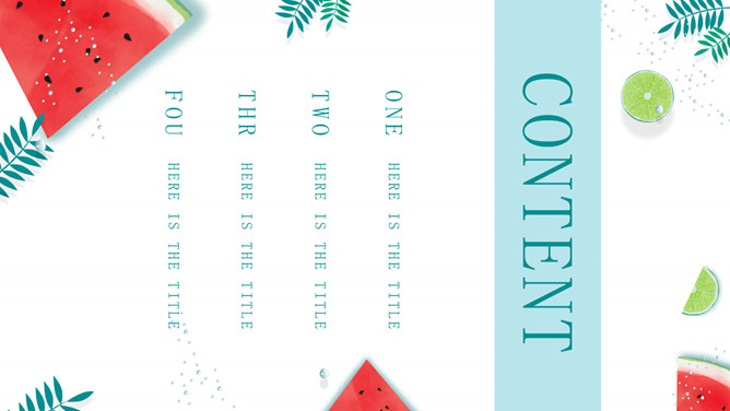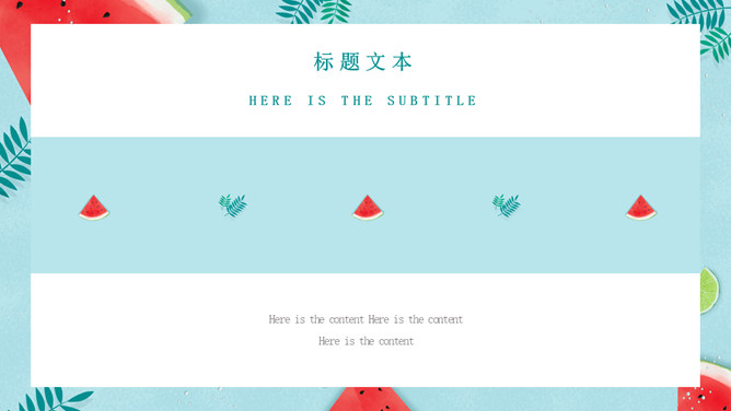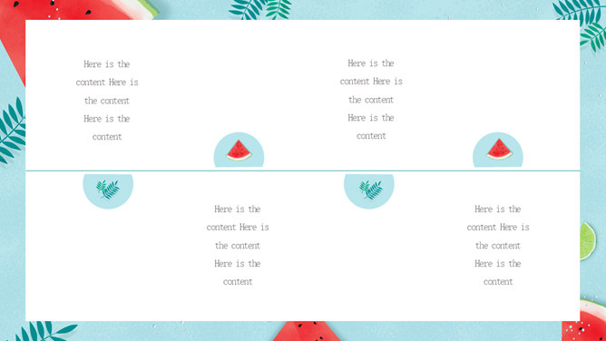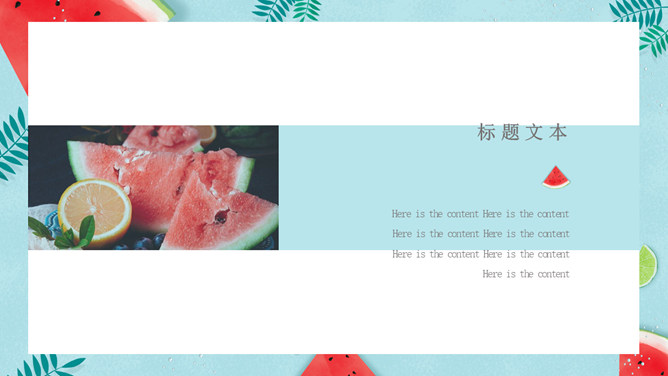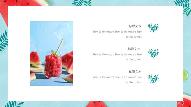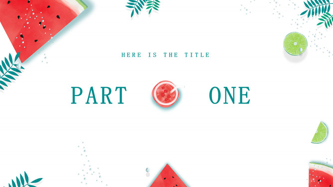 冰镇西瓜清凉夏天PPT模板。一套夏日清凉主题幻灯片模板,以冰镇西瓜饮料为背景,清新配色,为炎炎夏日增添清凉。