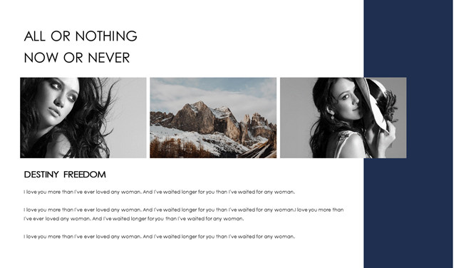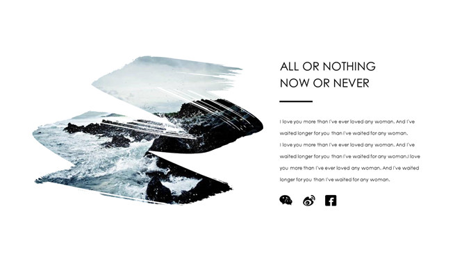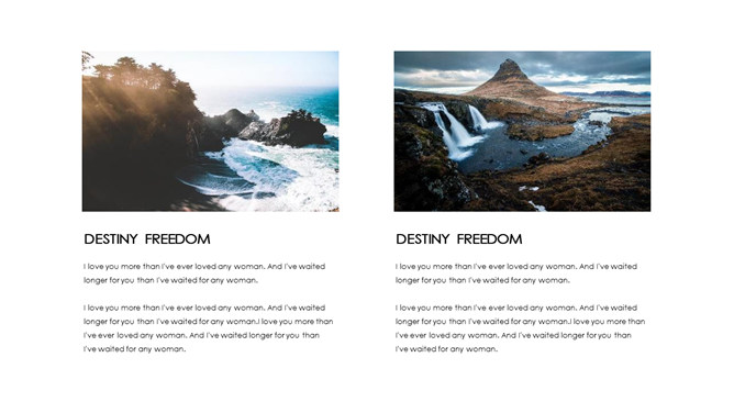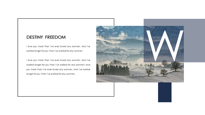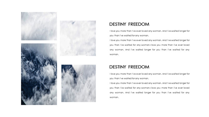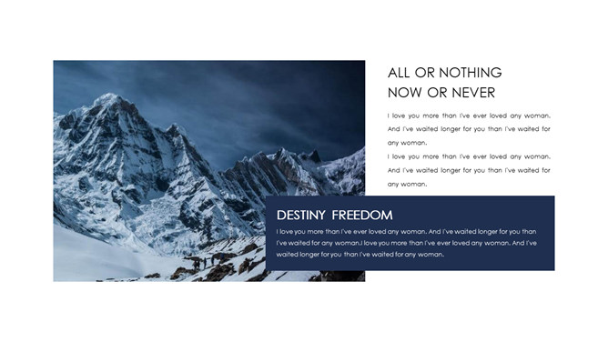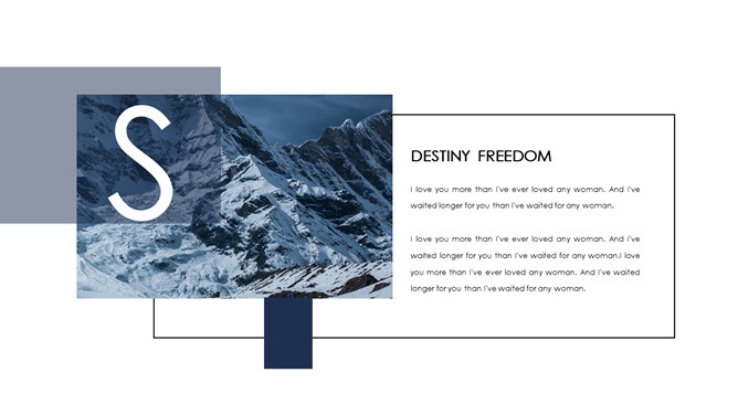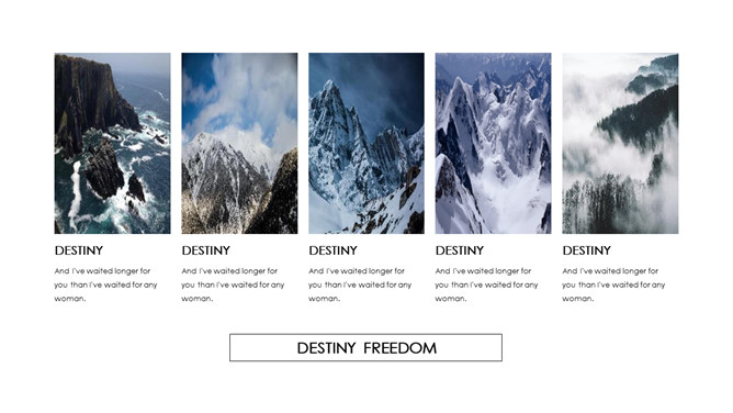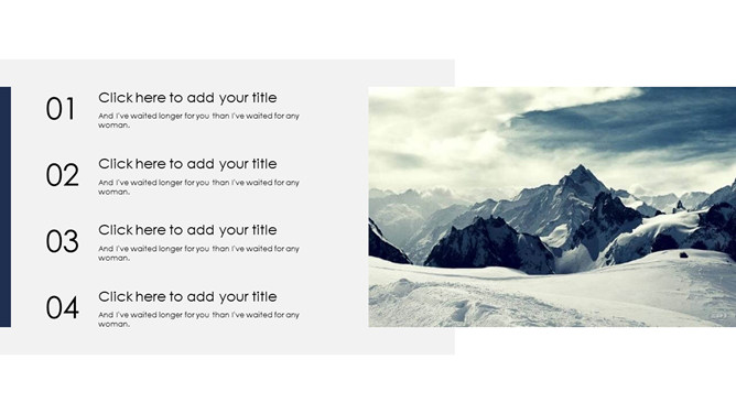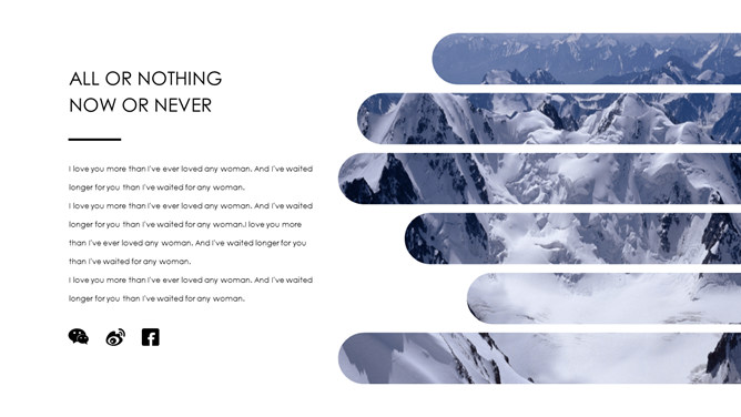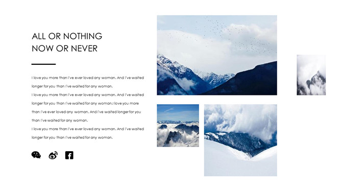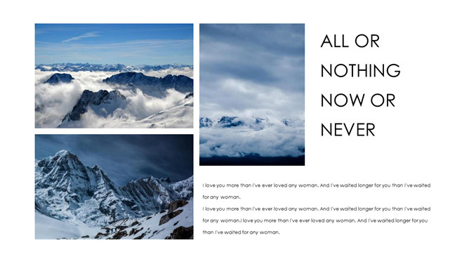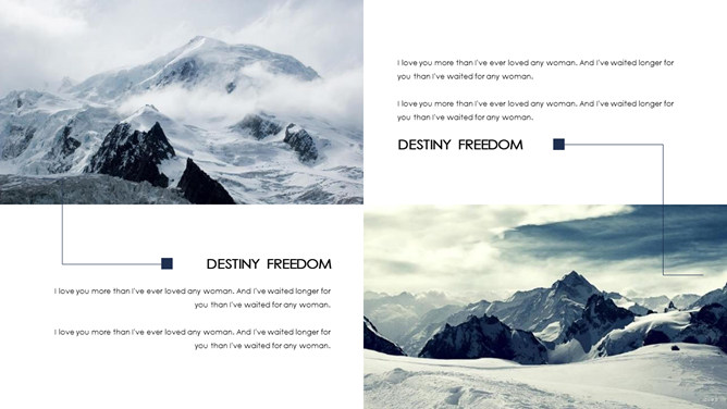 雪山画册相册图文排版PPT模板。一套雪山风景分光幻灯片模板,全部是图文排版页面,类型丰富实用。