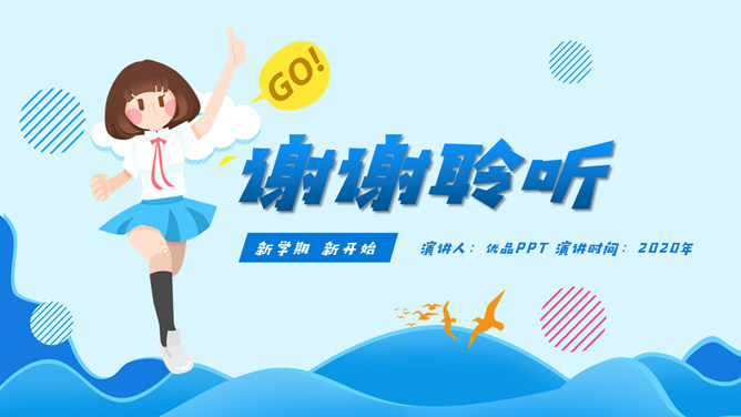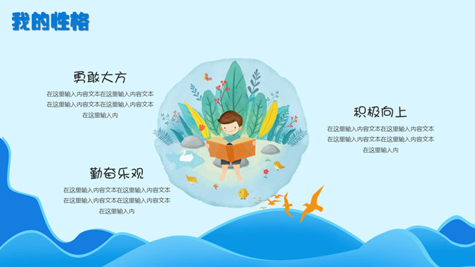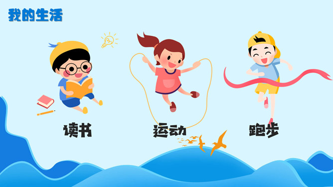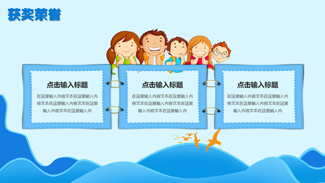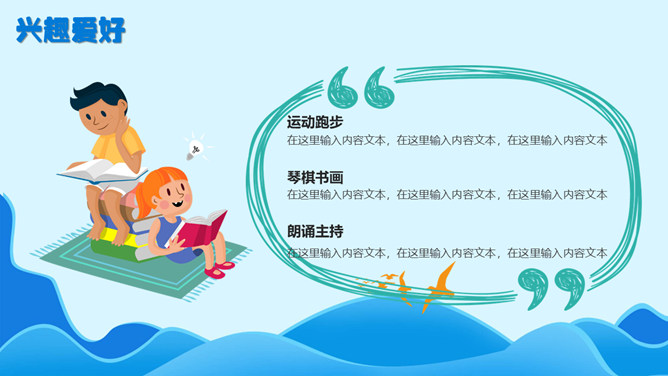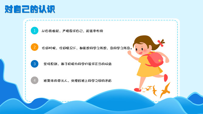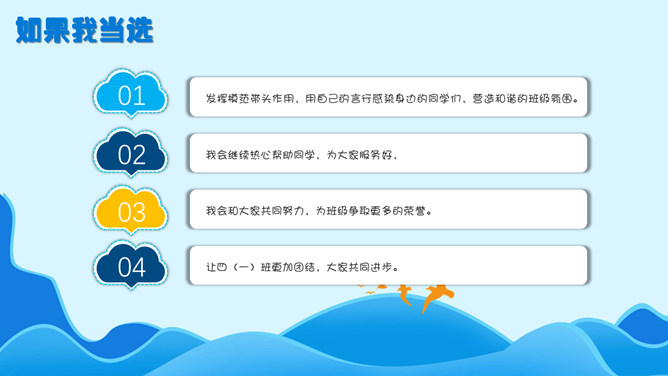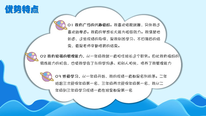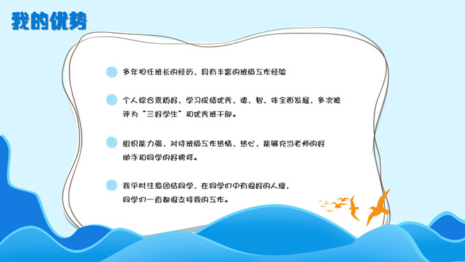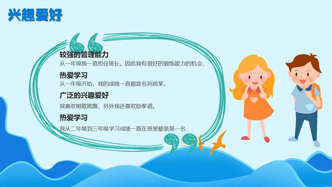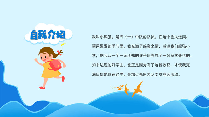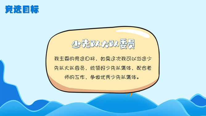 卡通班干部大队委员竞选PPT模板。一套大队委员、班干部竞选模板,卡通设计风格,清新蓝色主色调。