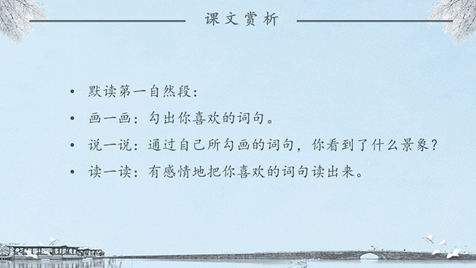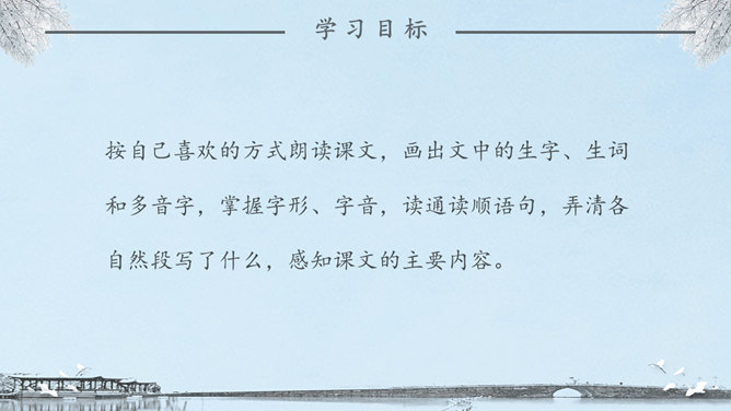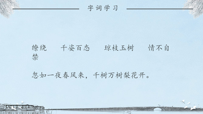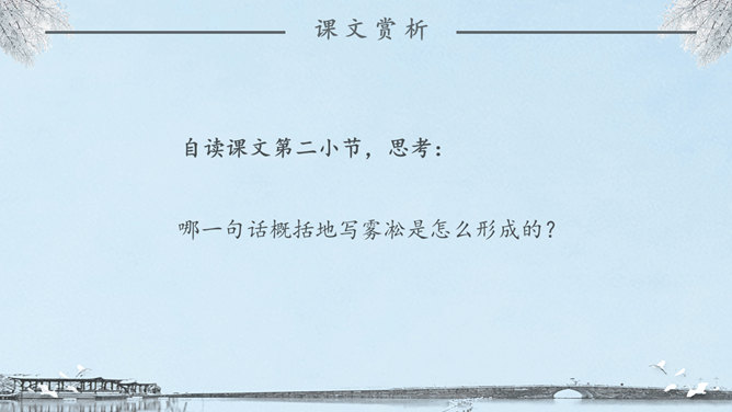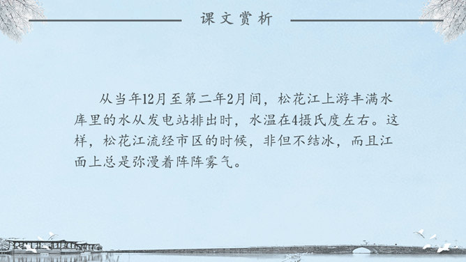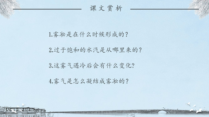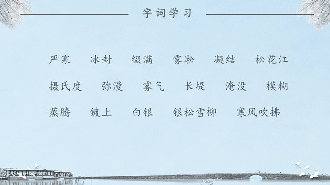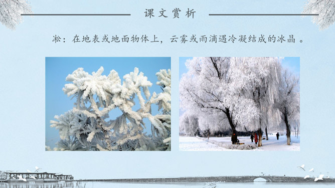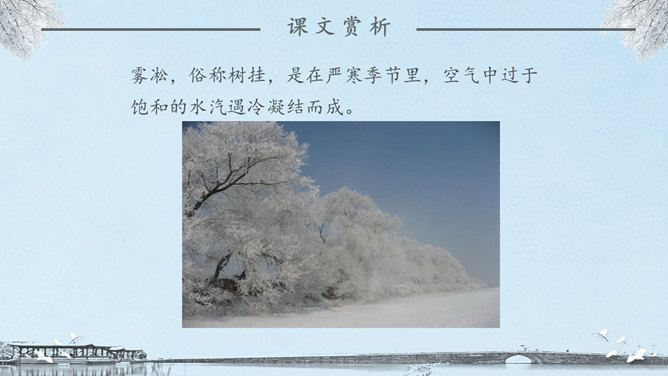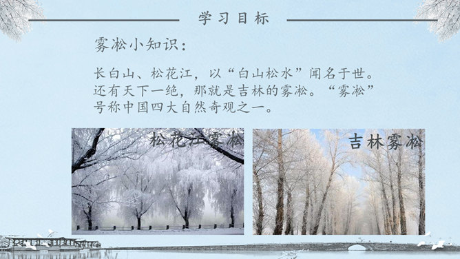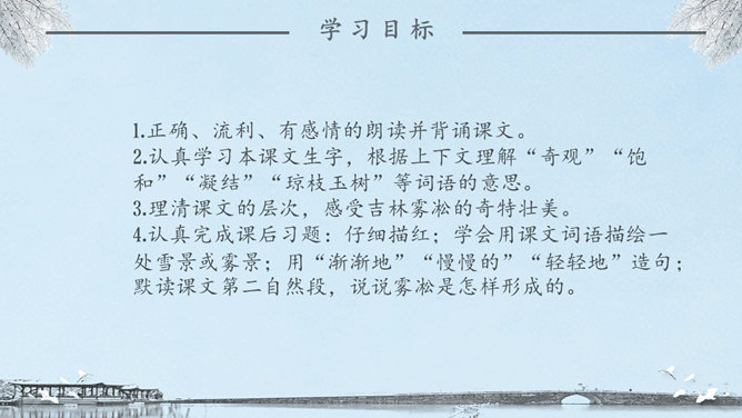 雾凇小知识:长白山、松花江,以“白山松水”闻名于世。还有天下一绝,那就是吉林的雾凇。“雾凇”号称中国四大自然奇观之一。学习目标:1.正确、流利、有感情的朗读并背诵课文。2.认真学习本课文生字,根据上下文理解“奇观”“饱和”“凝结”“琼枝玉树”等词语的意思。3.理清课文的层次,感受吉林雾凇的奇特壮美。4.认真完成课后习题:仔细描红;学会用课文词语描绘一处雪景或雾景;用“渐渐地”“慢慢的”“轻轻地”造句;默读课文第二自然段,说说雾凇是怎样形成的。按自己喜欢的方式朗读课文,画出文中的生字、生词和多音字,掌握字形、字音,读通读顺语句,弄清各自然段写了什么,感知课文的主要内容。默读第一自然段:画一画:勾出你喜欢的词句。说一说:通过自己所勾画的词句,你看到了什么景象?读一读:有感情地把你喜欢的词句读出来。自读课文第二小节,思考:哪一句话概括地写雾凇是怎么形成的?