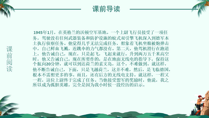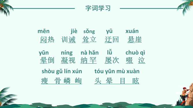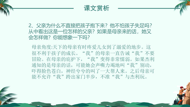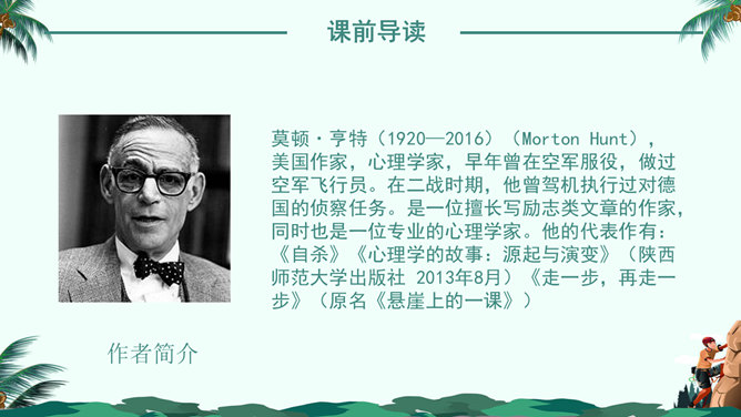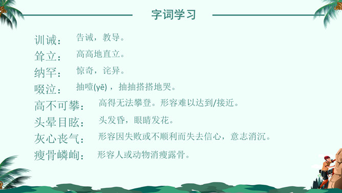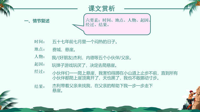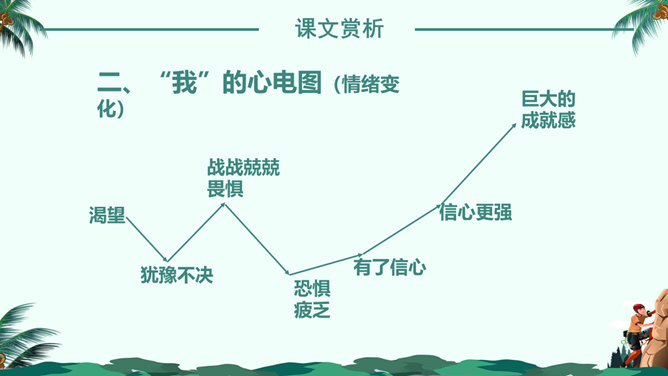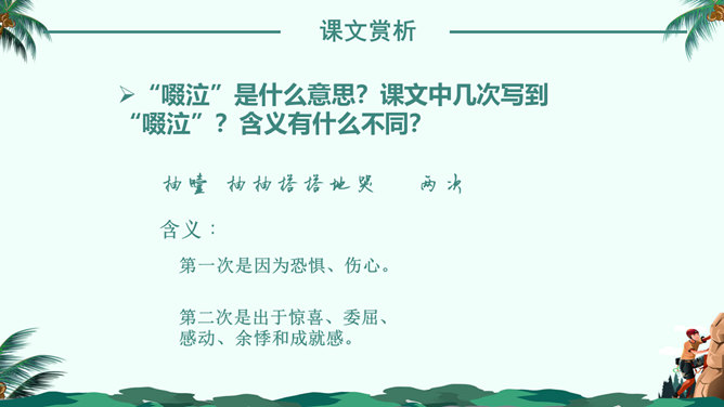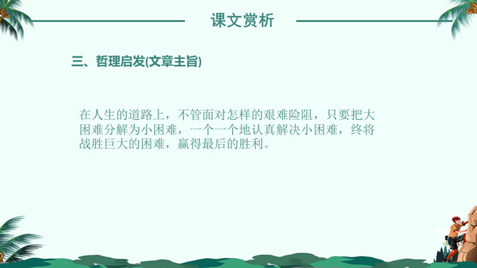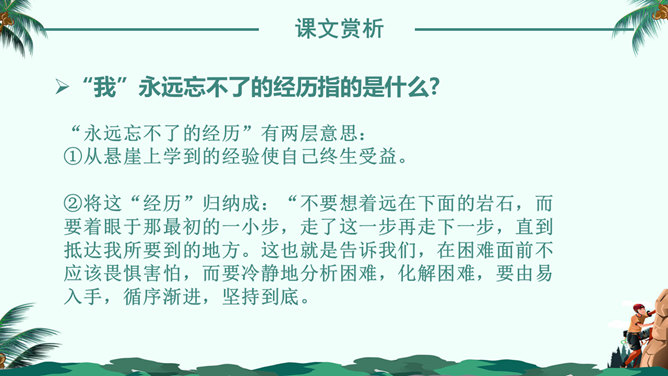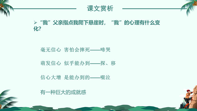 “我”父亲指点我爬下悬崖时,“我”的心理有什么变化?毫无信心 害怕会摔死——啼哭。萌发信心 似乎能办到——探、移。信心大增 是能办到的——啜泣。有一种巨大的成就感。哲理启发(文章主旨):在人生的道路上,不管面对怎样的艰难险阻,只要把大困难分解为小困难,一个一个地认真解决小困难,终将战胜巨大的困难,赢得最后的胜利。“啜泣”是什么意思?课文中几次写到“啜泣”?含义有什么不同?抽噎 抽抽搭搭地哭 两次。含义:第一次是因为恐惧、伤心。第二次是出于惊喜、委屈、感动、余悸和成就感。“我”永远忘不了的经历指的是什么?“永远忘不了的经历”有两层意思:①从悬崖上学到的经验使自己终生受益。②将这“经历”归纳成:“不要想着远在下面的岩石,而要着眼于那最初的一小步,走了这一步再走下一步,直到抵达我所要到的地方。这也就是告诉我们,在困难面前不应该畏惧害怕,而要冷静地分析困难,化解困难,要由易入手,循序渐进,坚持到底。所属专题:走一步再走一步ppt。