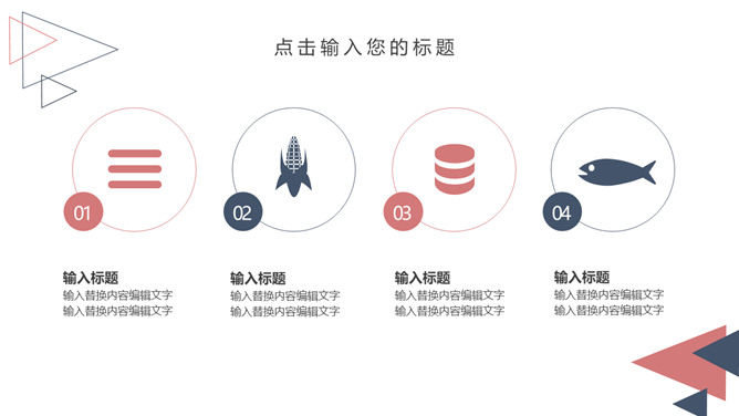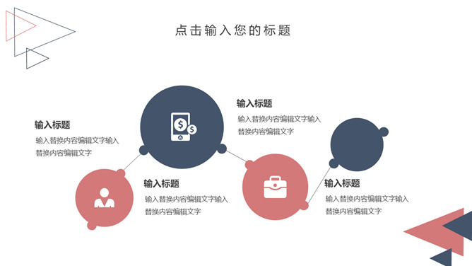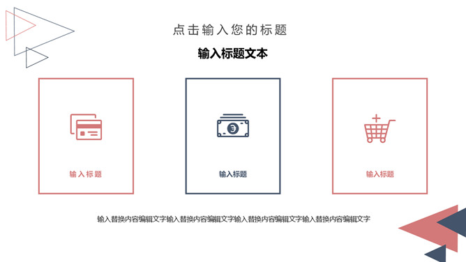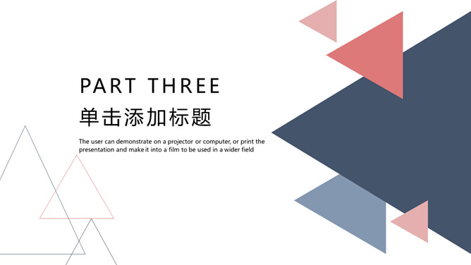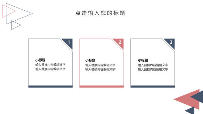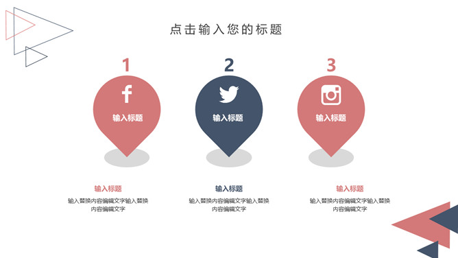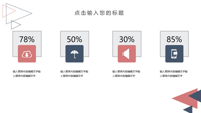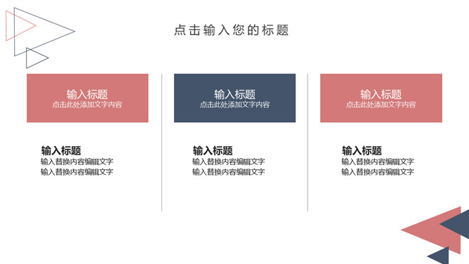 简洁创意三角风通用PPT模板。一套简约大气幻灯片模板,创意三角主元素设计,红蓝配色,多图表页面,通用性强。