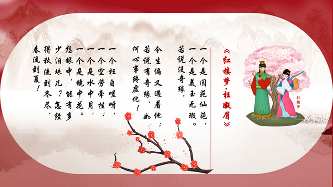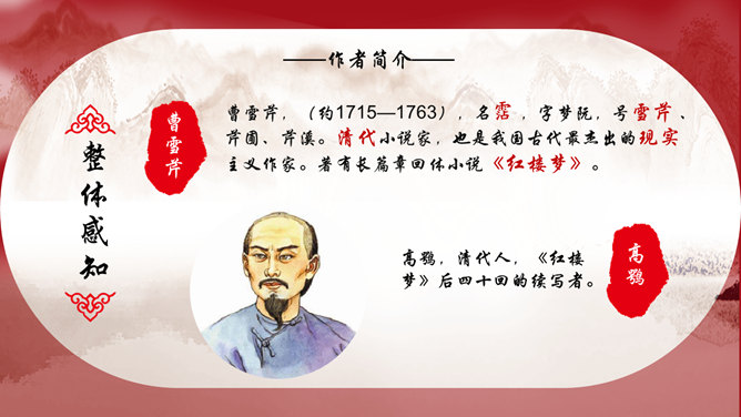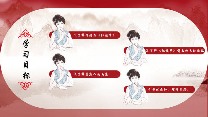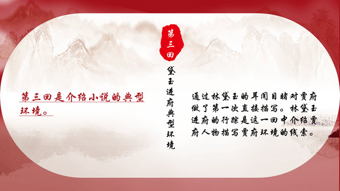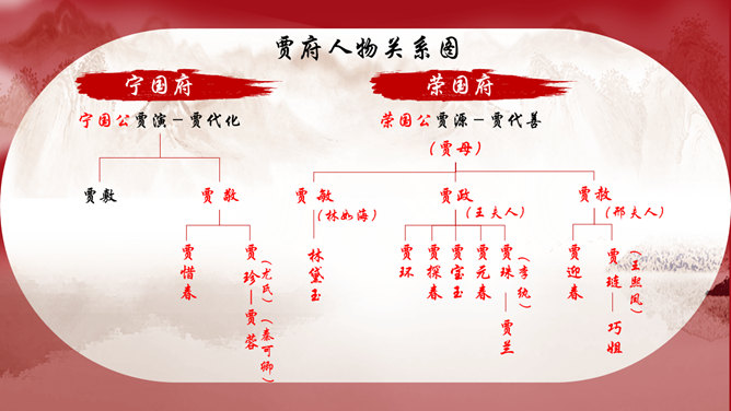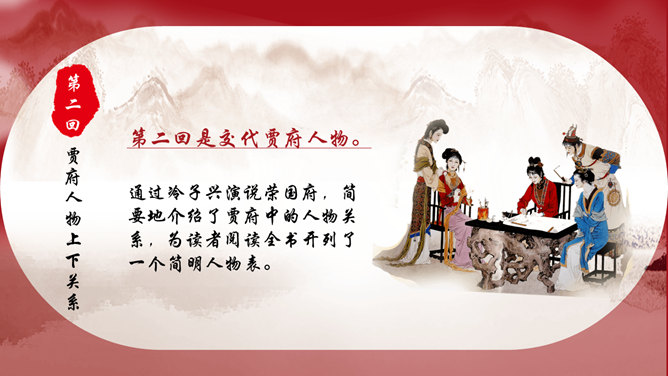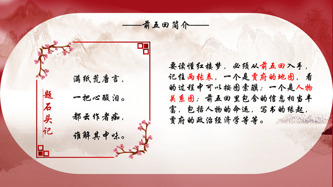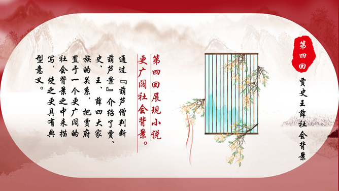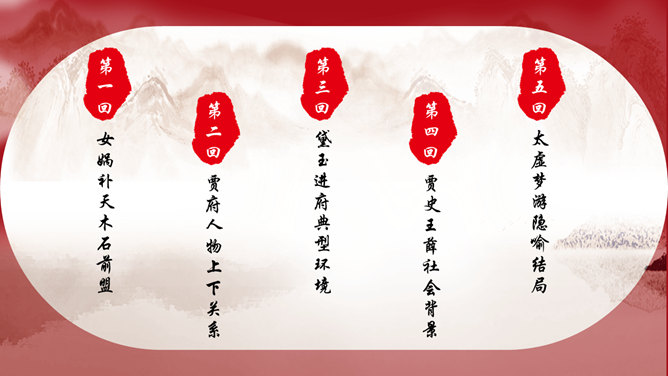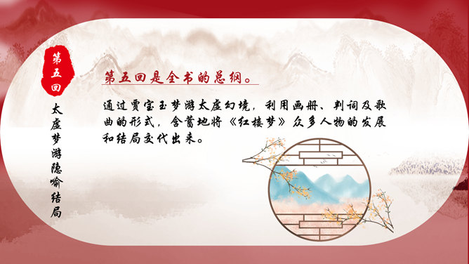 用“女娲补天”、“木石前盟”两个神话故事作楔子。在“女祸补天”的故事中,作者特意描写了一块无材补天的顽石,这便是随贾宝玉一起降生又为贾宝玉随身佩戴的通灵宝玉。它对贾宝玉的叛逆性格有隐喻作用。通过冷子兴演说荣国府,简要地介绍了贾府中的人物关系,为读者阅读全书开列了一个简明人物表。通过林黛玉的耳闻目睹对贾府做了第一次直接描写。林黛玉进府的行踪是这一回中介绍贾府人物描写贾府环境的线索。 第四回展现小说更广阔社会背景。通过“葫芦僧判断葫芦案”介绍了贾、史、王、薛四大家族的关系,把贾府置于一个更广阔的社会背景之中来描写,使之更具有典型意义。第五回是全书的总纲。通过贾宝玉梦游太虚幻境,利用画册、判词及歌曲的形式,含蓄地将《红楼梦》众多人物的发展和结局交代出来。