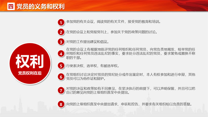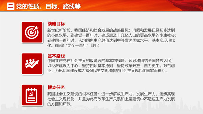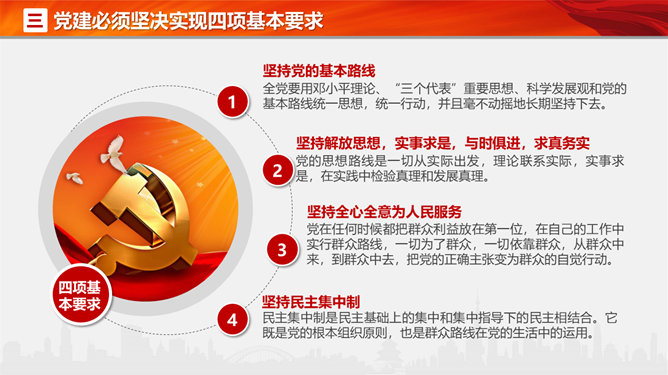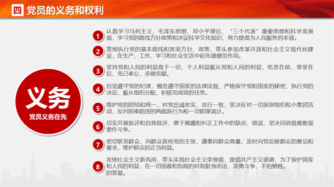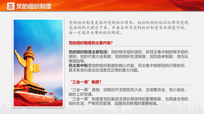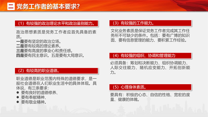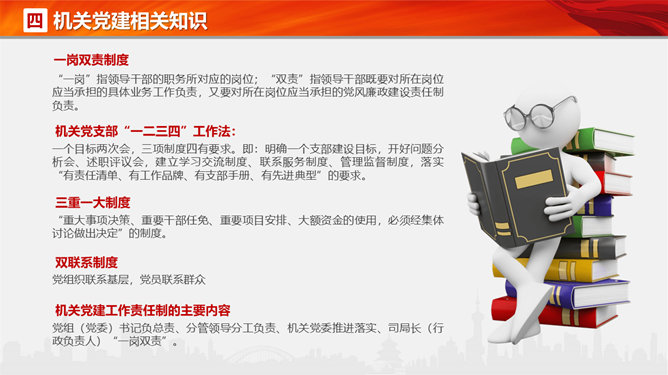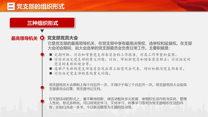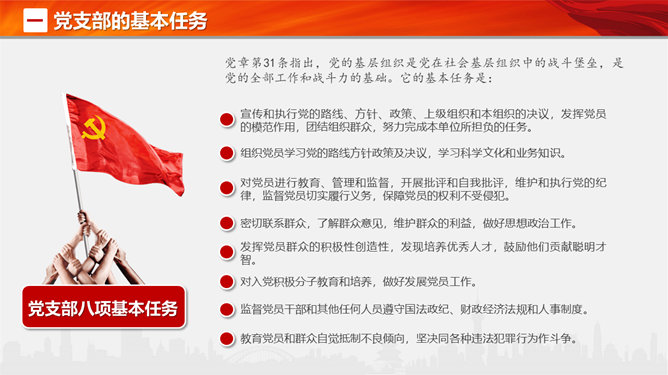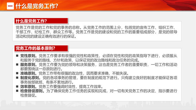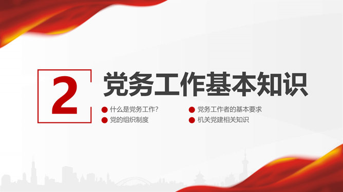 党支部党务知识培训PPT模板。包括党的基本知识、党务工作要点介绍、党支部相关知识概述、党支部日常工作实务几个部分。