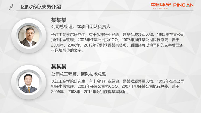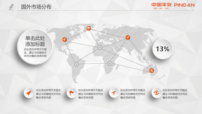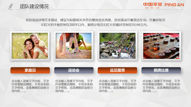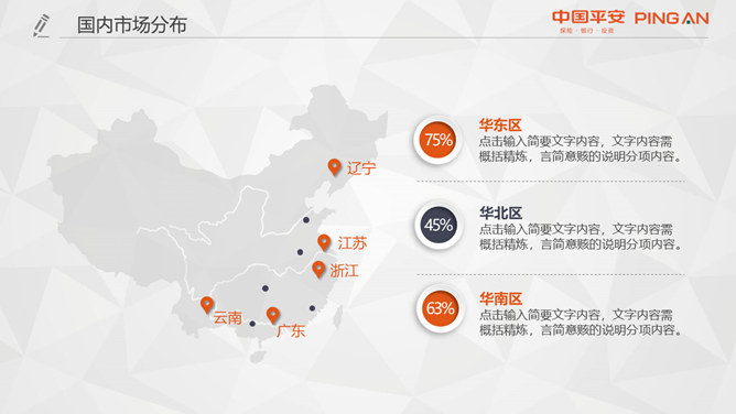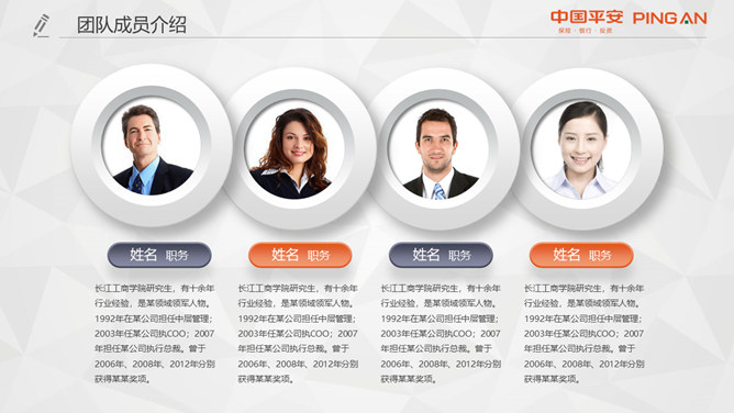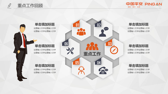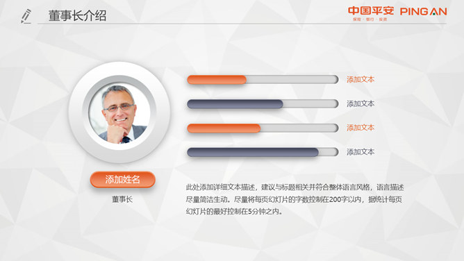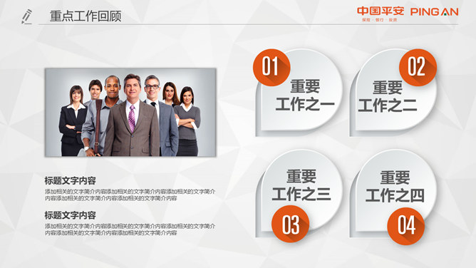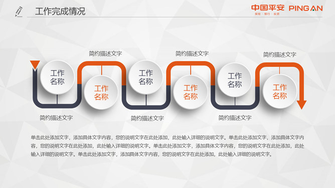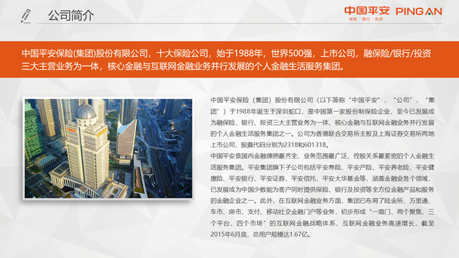 中国平安员工专用PPT模板。一套中国平安专用幻灯片模板,微粒体风格,页面类型丰富实用,适合中国平安员工工作总结计划汇报使用。
