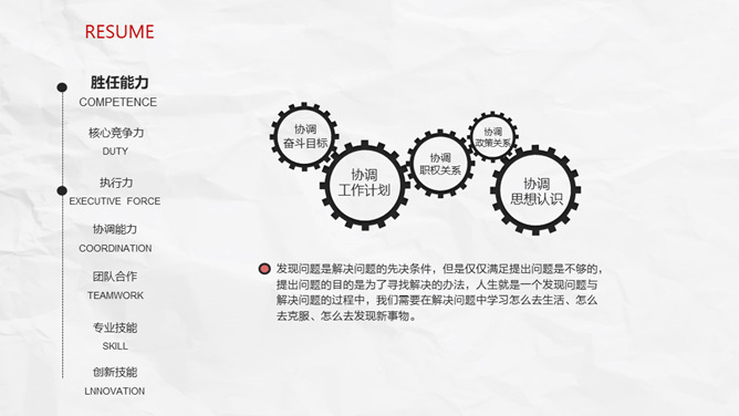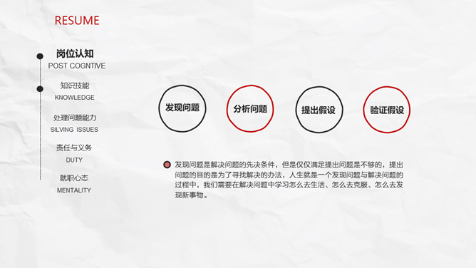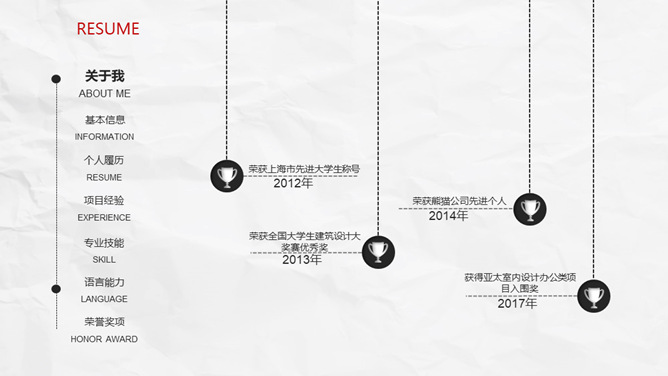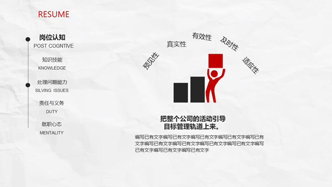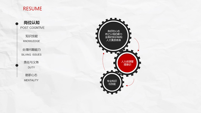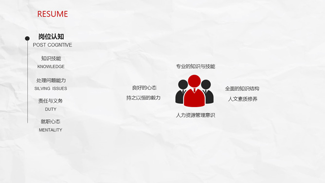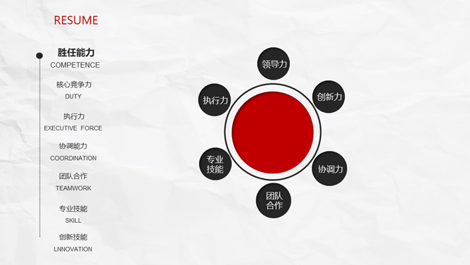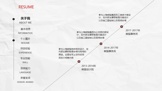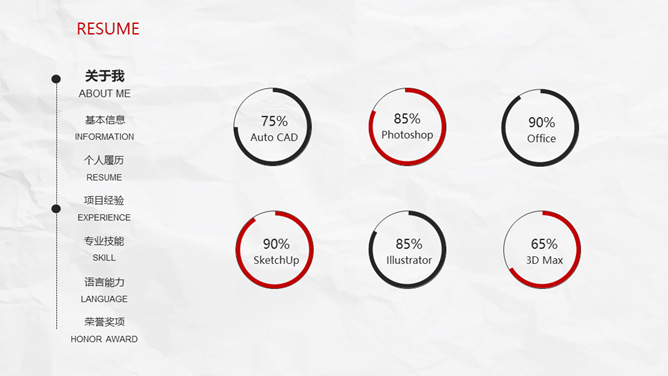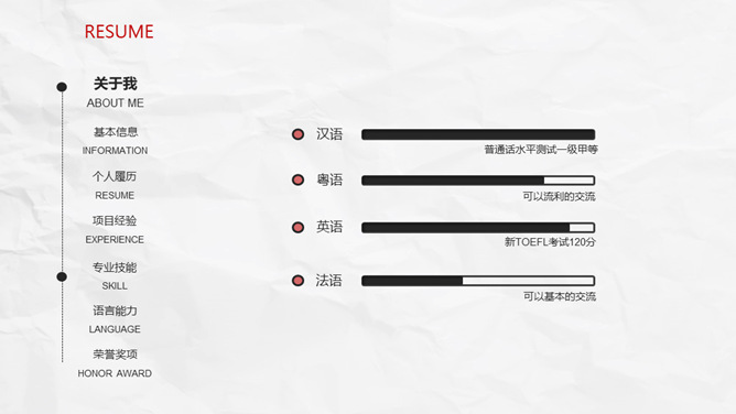 极简创意侧边导航个人简历PPT模板。一套创意个人简历幻灯片模板,纸质纹理背景,极简设计,红黑配色。