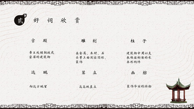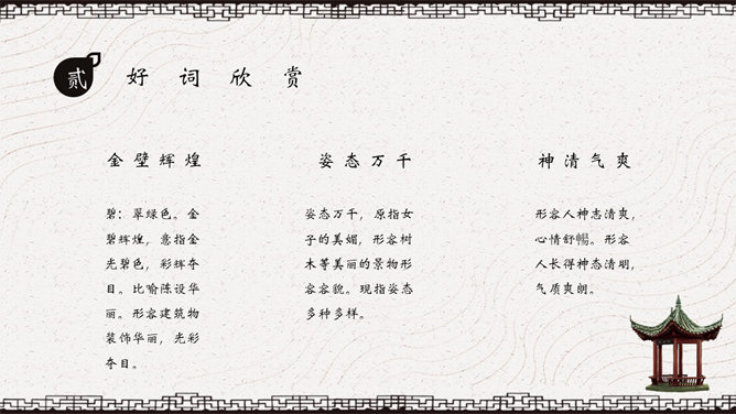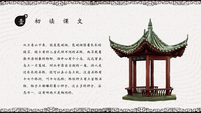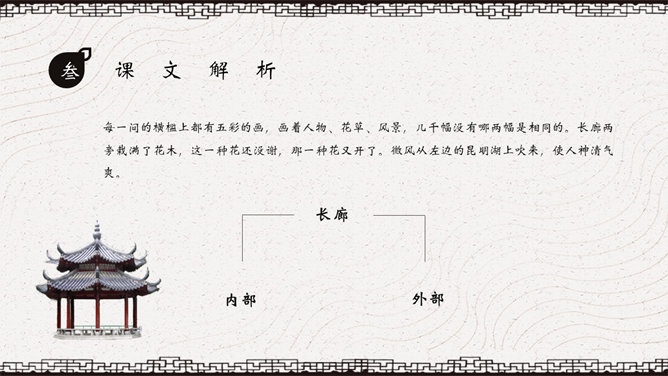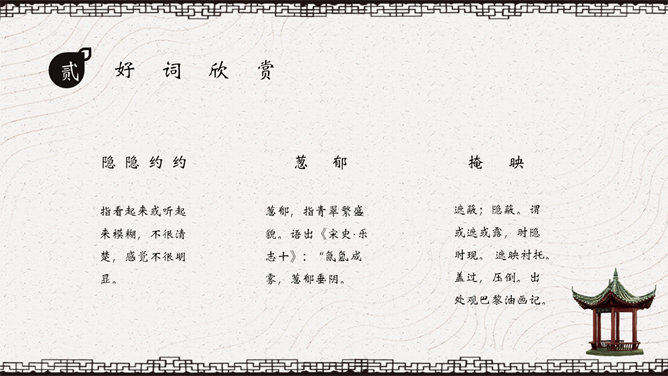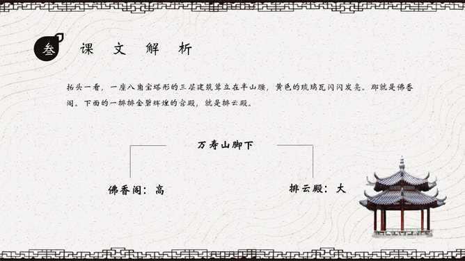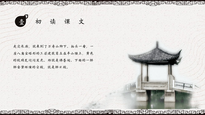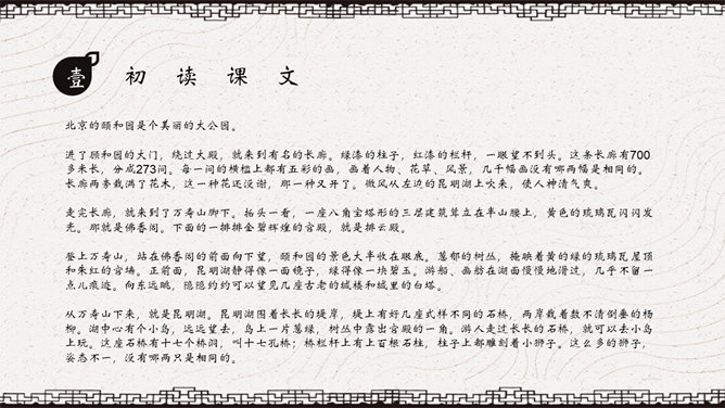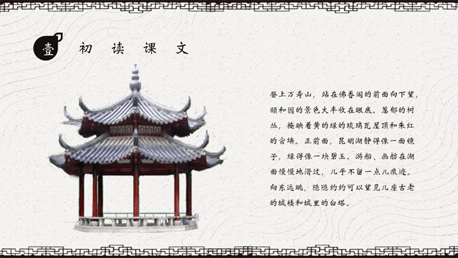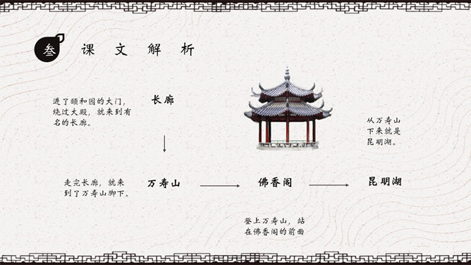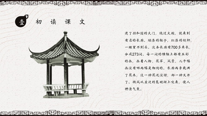 好词欣赏:隐隐约约,指看起来或听起来模糊,不很清楚,感觉不很明显。葱郁,指青翠繁盛貌。语出《宋史·乐志十》:“氤氲成雾,葱郁垂阴。遮蔽;隐蔽。谓或遮或露,时隐时现。 遮映衬托。盖过,压倒。出处观巴黎油画记。仿照《18 颐和园》介绍景观的写作手法,你也能用上一定的表达手法、按照一定的顺序向我们介绍你曾经去过的一处景观吗?长廊、佛香阁、昆明湖等景物的特点不同,作者描写的方法也不一样,请找出描写这些景物的句子。颐和园的景美,课文的语言也很美,把喜欢的部分背下来。所属专题:颐和园ppt。