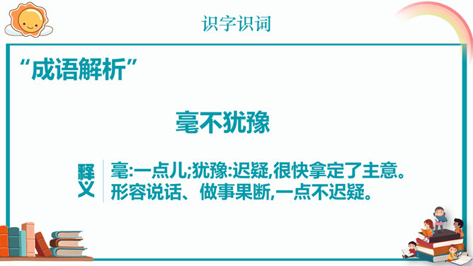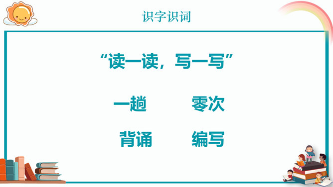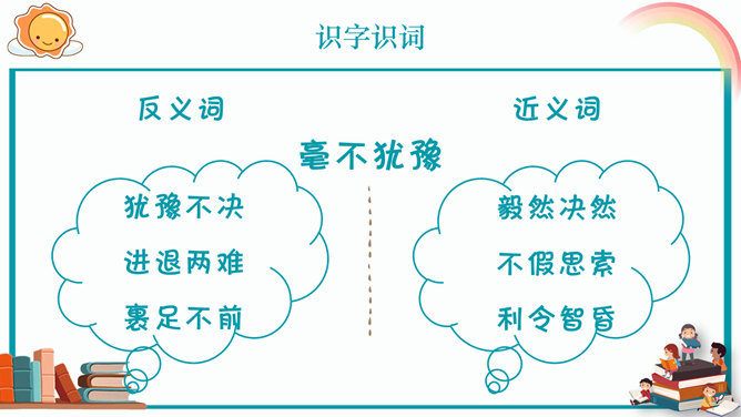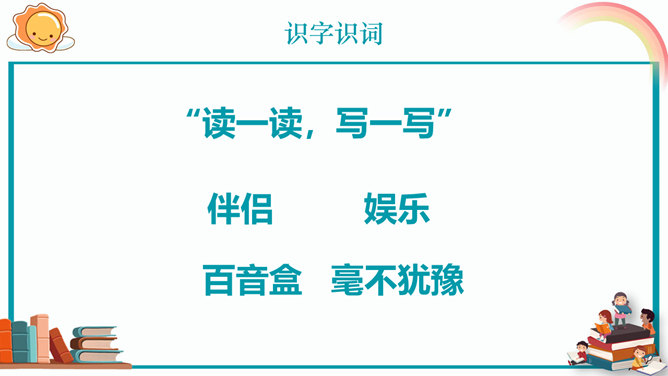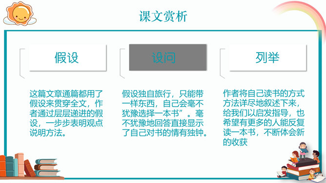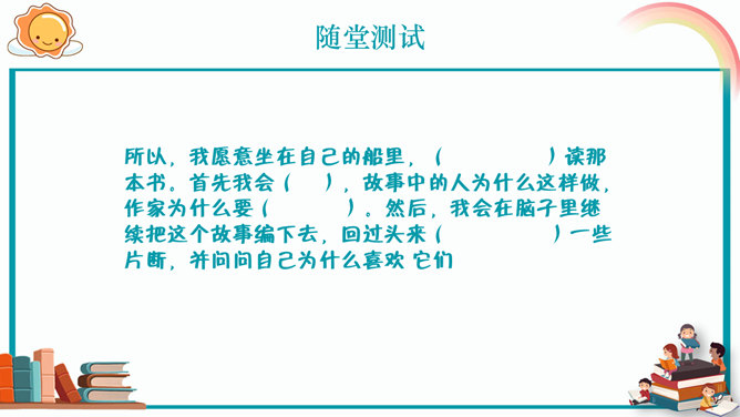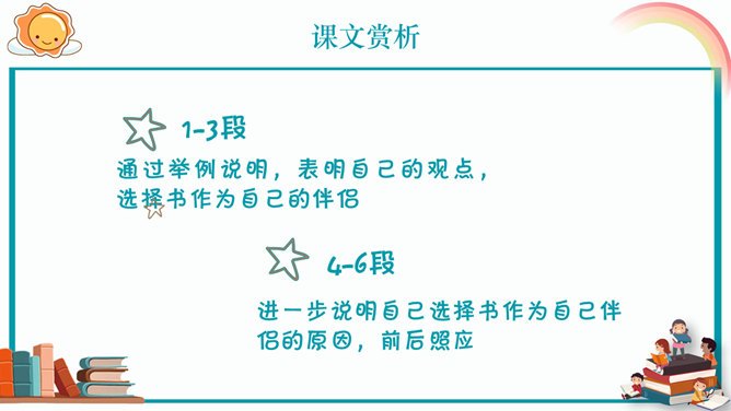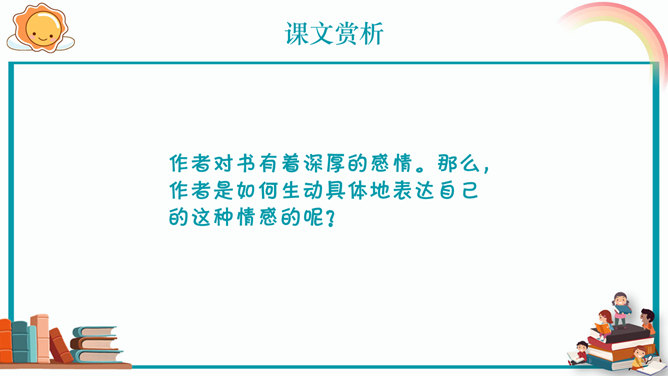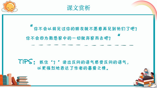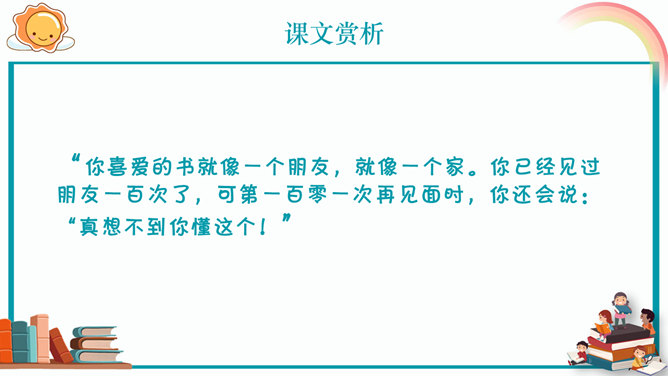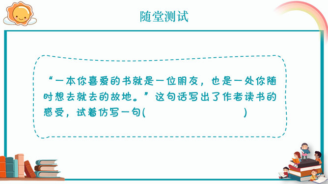 “你不会以前见过你的朋友就不愿意再见到他们了吧?你不会因为熟悉家中的一切就弃家而去吧?“。TIPS:抓住“?”读出反问的语气感受反问的语气,以更强烈地表达了作者的喜爱之情。假设独自旅行,只能带一样东西,自己会毫不犹豫选择一本书”。毫不犹豫地回答直接显示了自己对书的情有独钟。试着写出一句你积累的关于读书的名句 ,并用它通顺、连贯地写上几句话。选择你曾经读过的一本书,再读一读,看看有没有新的收获。有感情地朗读刚学过的课文中你自己喜欢的段落,并收集有关书的名言或比喻。