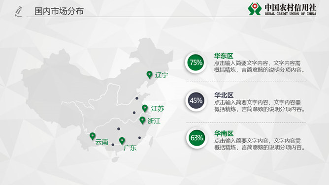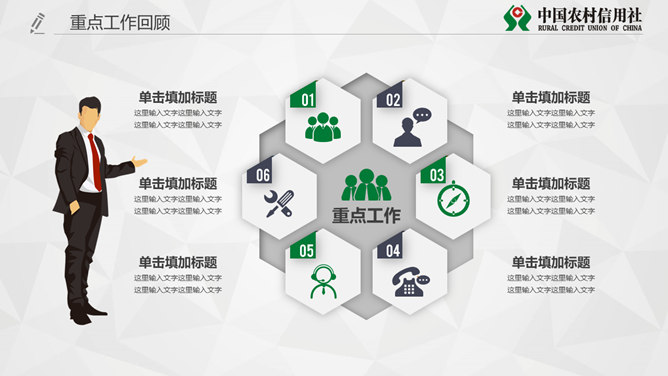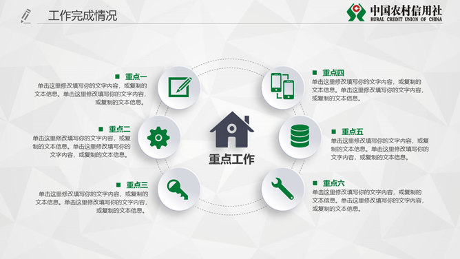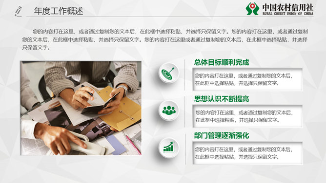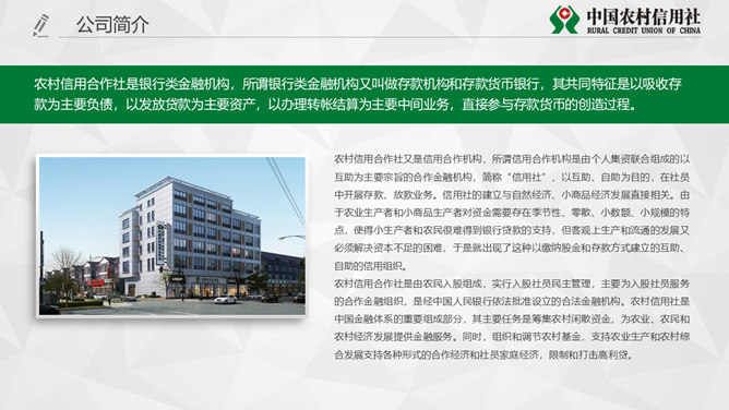 中国农村信用社专用PPT模板。一套农村信用合作社工作汇报总结计划专用幻灯片模板,页面类型丰富实用。