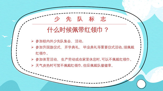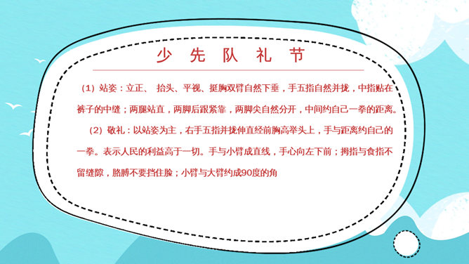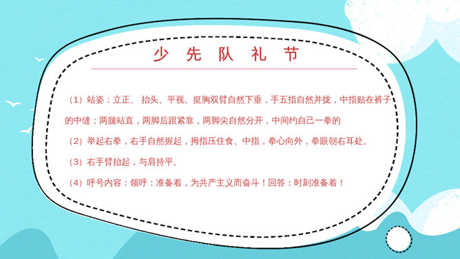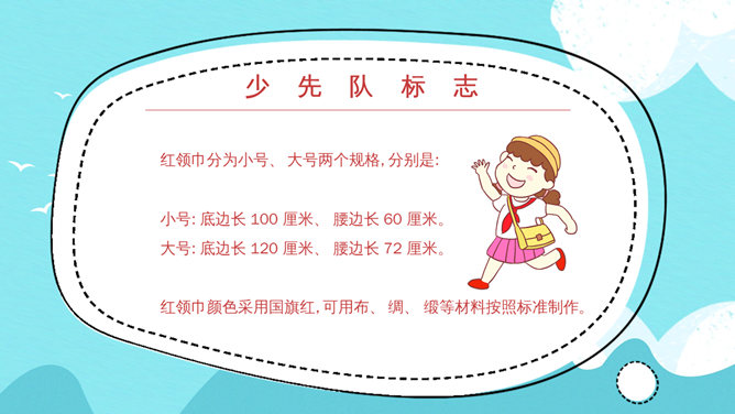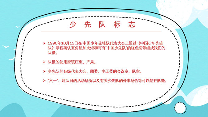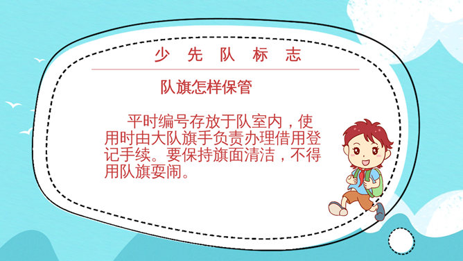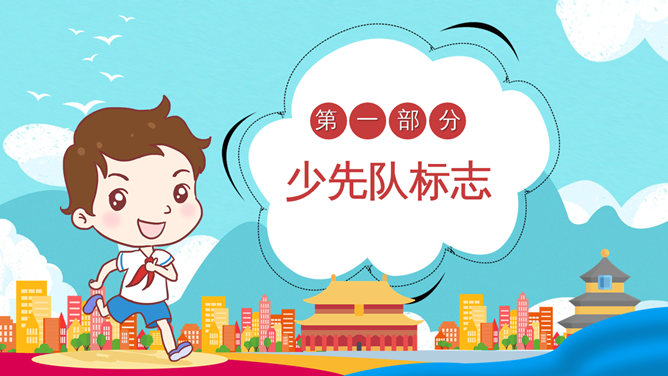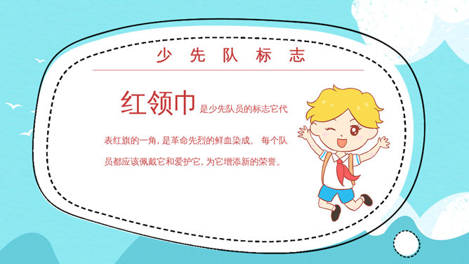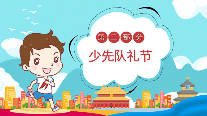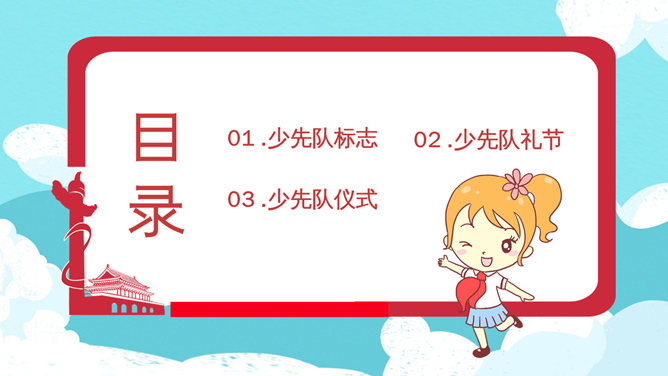 少先队礼仪知识介绍PPT模板。一套介绍中国少年先锋队礼仪知识的幻灯片模板,包括少先队标志、少先队礼节、少先队仪式几个部分。