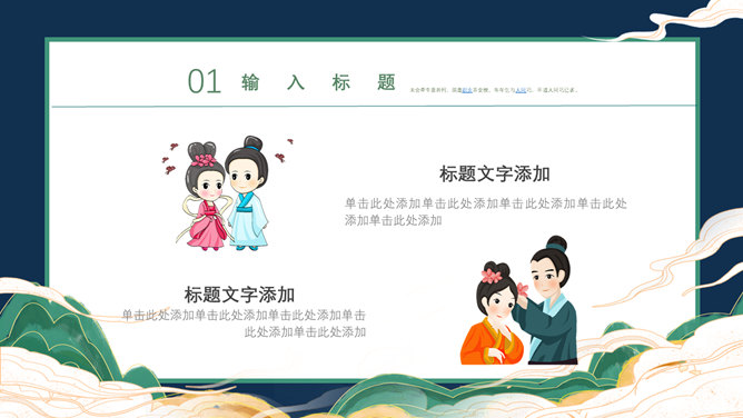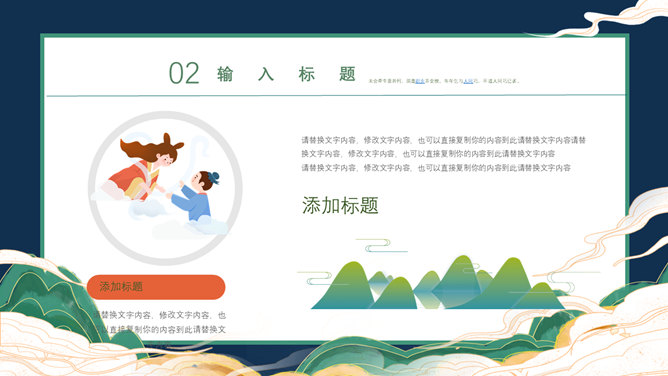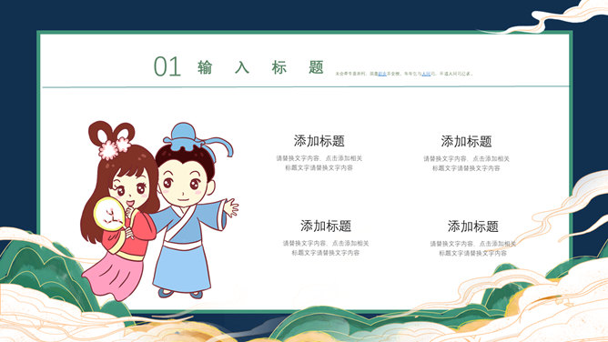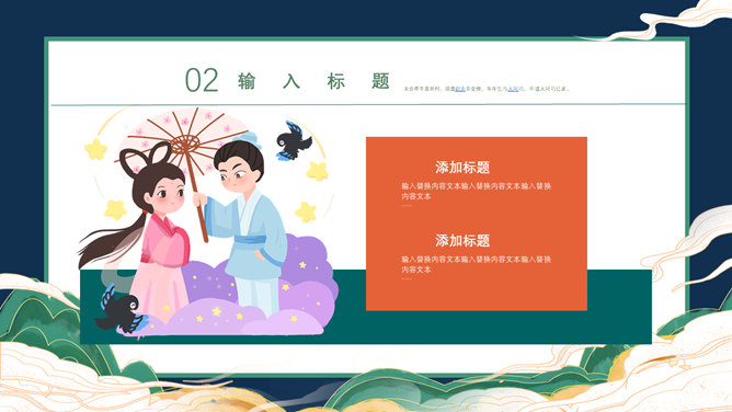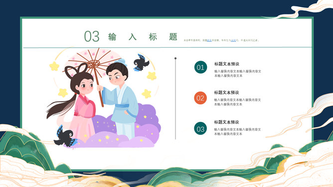 牛郎织女七夕情人节PPT模板。一套七夕节主题幻灯片模板,卡通牛郎织女背景,古风设计风格,