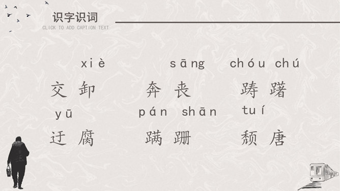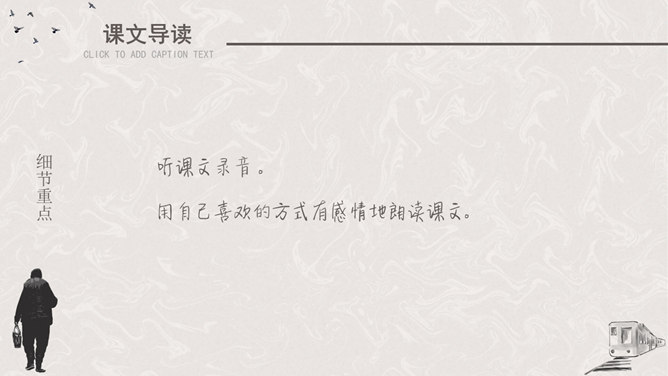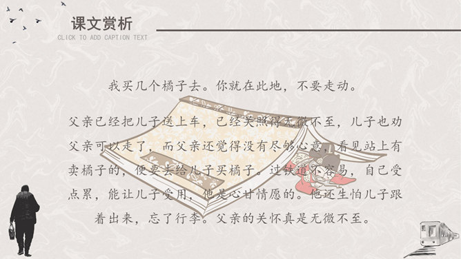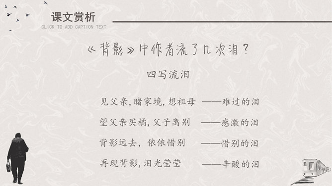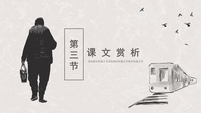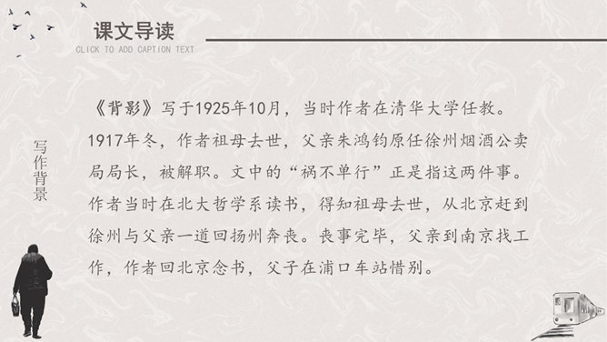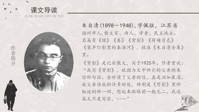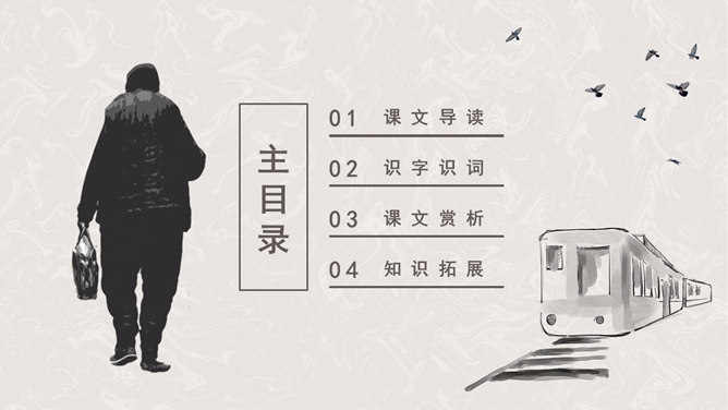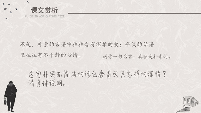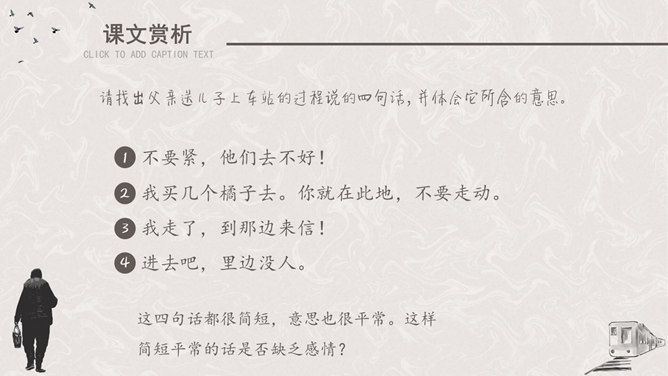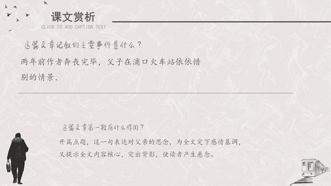 听课文录音 。用自己喜欢的方式有感情地朗读课文。请找出父亲送儿子上车站的过程说的四句话,并体会它所含的意思。这四句话都很简短,意思也很平常。这样简短平常的话是否缺乏感情?不是,朴素的言语中往往含有深挚的爱;平淡的话语里往往有不平静的心情。这句朴实而简洁的话包含着父亲怎样的深情?请具体说明。这篇文章记叙的主要事件是什么?两年前作者奔丧完毕,父子在浦口火车站依依惜别的情景。这篇文章第一段有什么作用?开篇点题,这一句表达对父亲的思念,为全文定下感情基调,又提示全文内容核心,突出背影,使读者产生悬念。找出对父亲的衣着描写,突出了什么颜色?为什么突出这种颜色?作者用了一个什么词描写父亲走路的姿势?这个词是什么意思?作者为什么用这个词?所属专题:背影ppt。