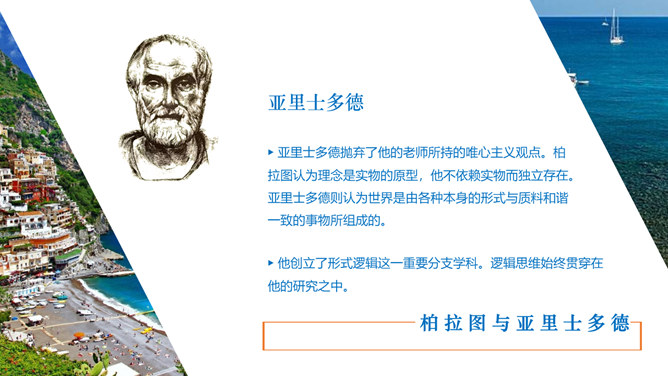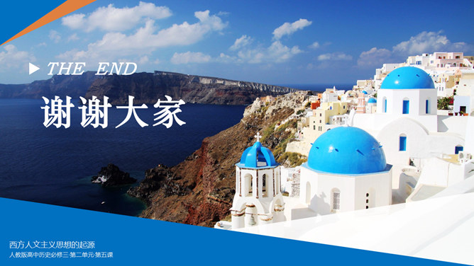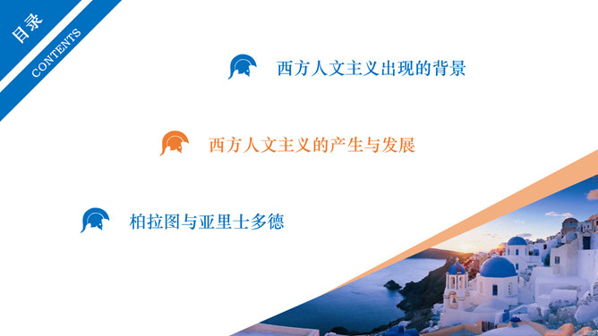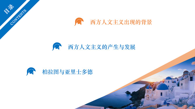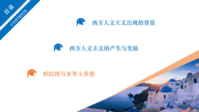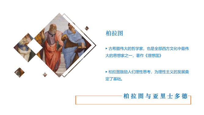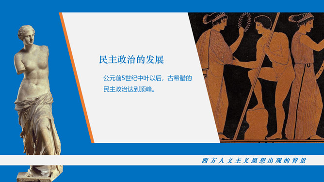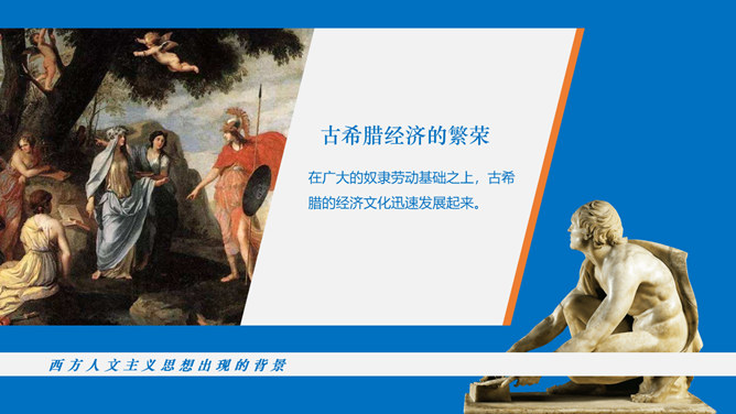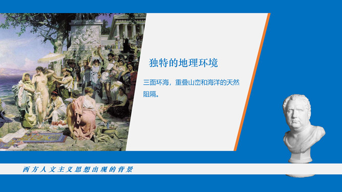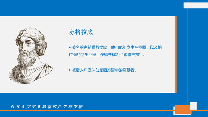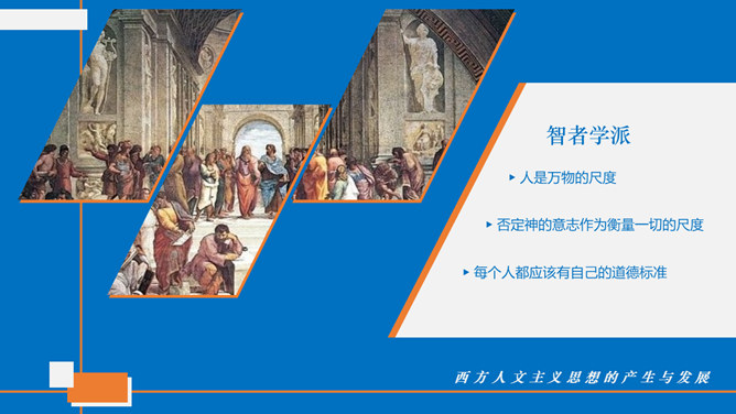 西方人文主义思想出现的背景。民主政治的发展:公元前5世纪中叶以后,古希腊的民主政治达到顶峰。古希腊经济的繁荣:在广大的奴隶劳动基础之上,古希腊的经济文化迅速发展起来。人的地位提高:民主政治制度和每个公民参与政治意识的加强,使人的中心地位日益突出。独特的地理环境:三面环海,重叠山峦和海洋的天然阻隔。西方人文主义的产生与发展。智者学派:人是万物的尺度;否定神的意志作为衡量一切的尺度;每个人都应该有自己的道德标准。苏格拉底:著名的古希腊哲学家,他和他的学生柏拉图,以及柏拉图的学生亚里士多德并称为“希腊三贤”;被后人广泛认为是西方哲学的奠基者。柏拉图与亚里士多德。柏拉图:古希腊伟大的哲学家,也是全部西方文化中最伟大的思想家之一,著作《理想国》;柏拉图鼓励人们理性思考,为理性主义的发展奠定了基础。