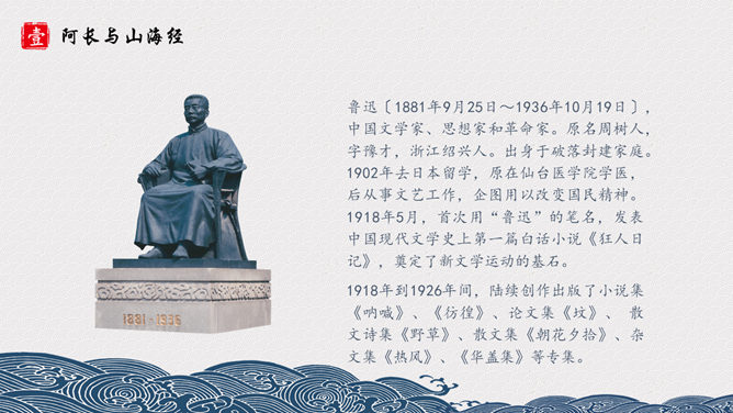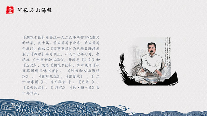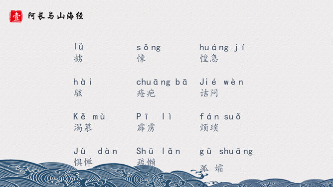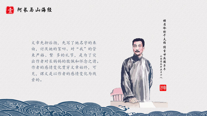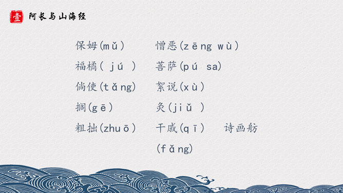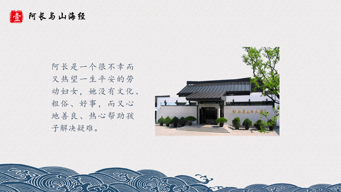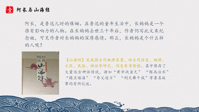 长妈妈是个什么样的人呢?《山海经》是我国古代地理名著,对古代历史、地理、文化、民俗、神话等研究,均有参考价值。其中保存了大量远古神话传说,诸如“黄帝战蚩尤” “鲧禹治水” “精卫填海” “夸父逐日” “刑天舞干戚”等著名故事均有所记述。阿长是一个很不幸而又热望一生平安的劳动妇女,她没有文化、粗俗、好事,而又心地善良、热心帮助孩子解决疑难。文章先抑后扬,先写了她名字的来由,讨厌她的絮叨、对“我”的管束严格、繁 多的礼节,是为了突出作者对长妈妈的敬佩和怀念之请。作者的感情变化贯穿文章始终,可见,课文是以作者的感情变化为线索的。所属专题:阿长与山海经ppt。