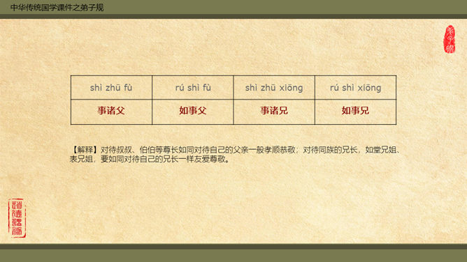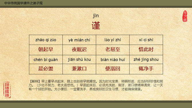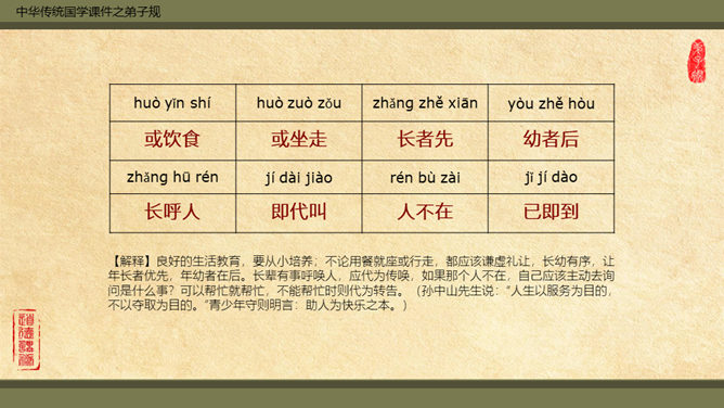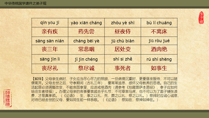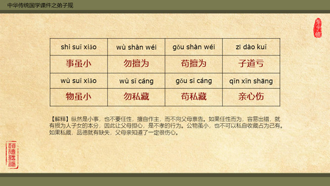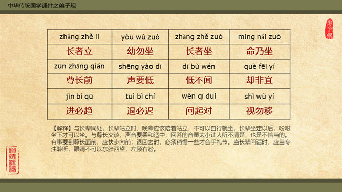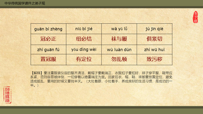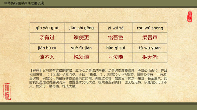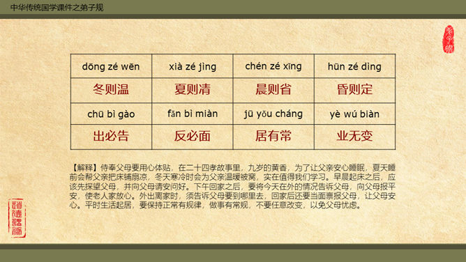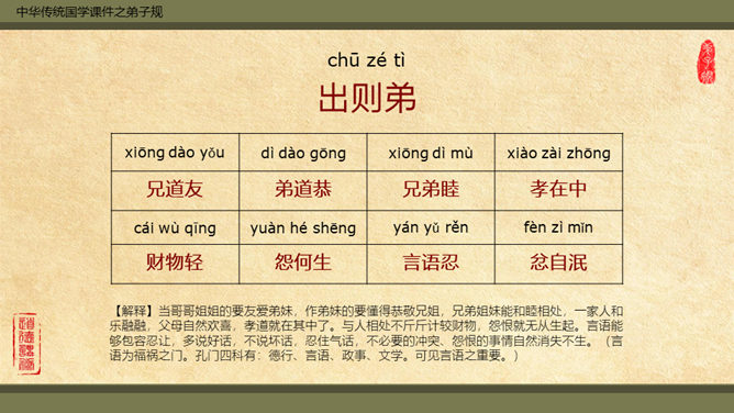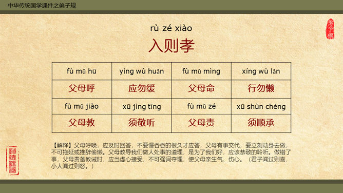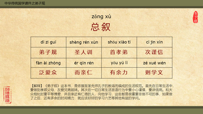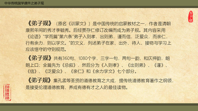 《弟子规》(原名《训蒙文》)是中国传统的启蒙教材之一,作者是清朝康熙年间的秀才李毓秀。后经贾存仁修订改编而成为弟子规。其内容采用《论语》“学而篇”第六条“弟子入则孝,出则弟,谨而信,泛爱众,而亲仁,行有余力,则以学文。”的文义,列述弟子在家、出外、待人、接物与学习上应该恪守的守则规范。集孔孟等圣贤的道德教育之大成,提传统道德教育著作之纲领,是接受伦理道德教育、养成有德有才之人的最佳读物。共有360句、1080个字,三字一句,两句一韵,和仄押韵,朗朗上口;全篇先为《总叙》,然后分为《入则孝》、《出则弟》、《谨》、《信》、《泛爱众》、《亲仁》和《余力学文》七个部分。