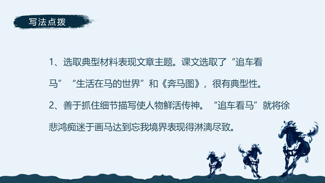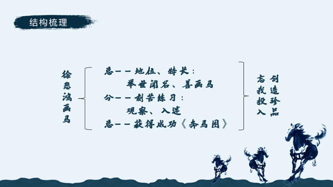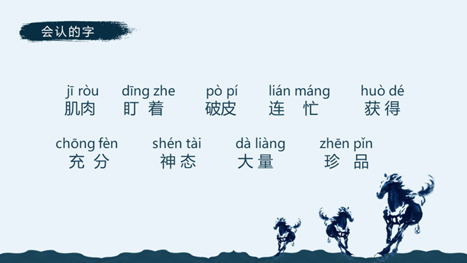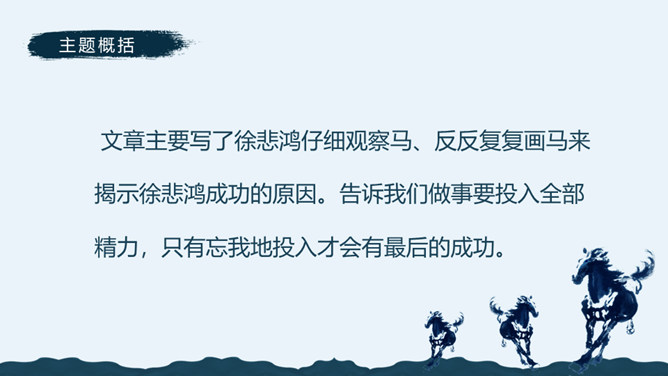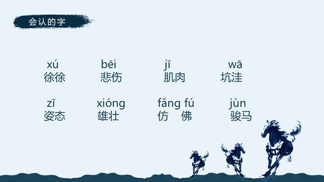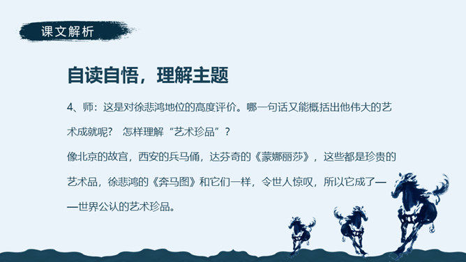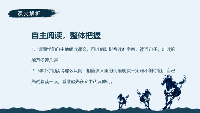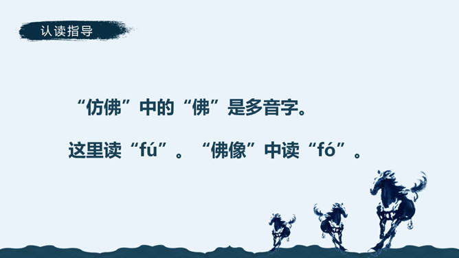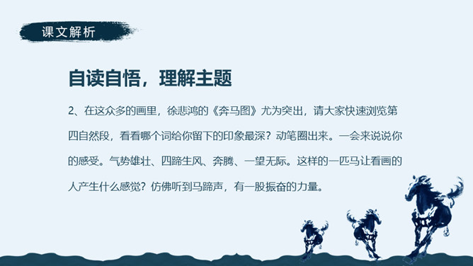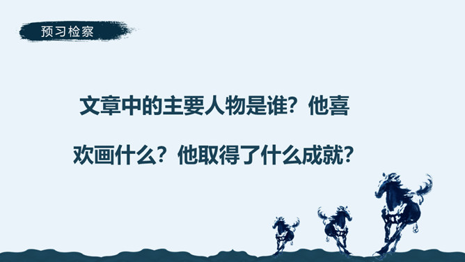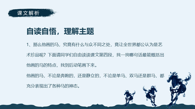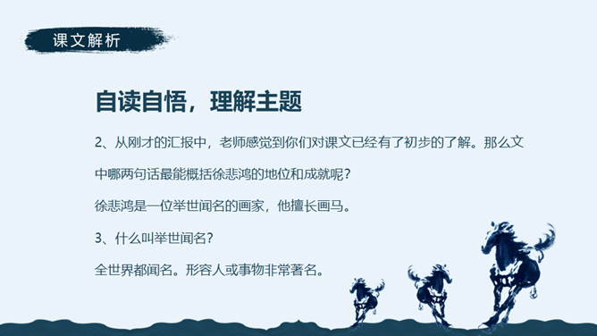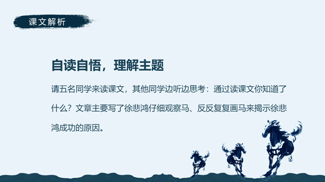 徐悲鸿:中国现代画家、美术教育家,中国现代美术的奠基者,与张书旗、柳子谷三人被称为画坛的“金陵三杰”。擅长人物、走兽、花鸟,主张现实主义,对当时中国画坛影响甚大。所作国画彩墨浑成,尤以奔马享名于世。“仿佛”中的“佛”是多音字。这里读“fú”。“佛像”中读“fó”。文章中的主要人物是谁?他喜欢画什么?他取得了什么成就?自主阅读,整体把握1、请同学们自由地朗读课文,可以借助拼音读准字音,读通句子,难读的地方多读几遍。2、刚才你们读得那么认真,相信课文里的词语朋友一定难不倒你们。自己先试着读一读,看谁最先在文中认识他们。自读自悟,理解主题,请五名同学来读课文,其他同学边听边思考:通过读课文你知道了什么?文章主要写了徐悲鸿仔细观察马、反反复复画马来揭示徐悲鸿成功的原因。