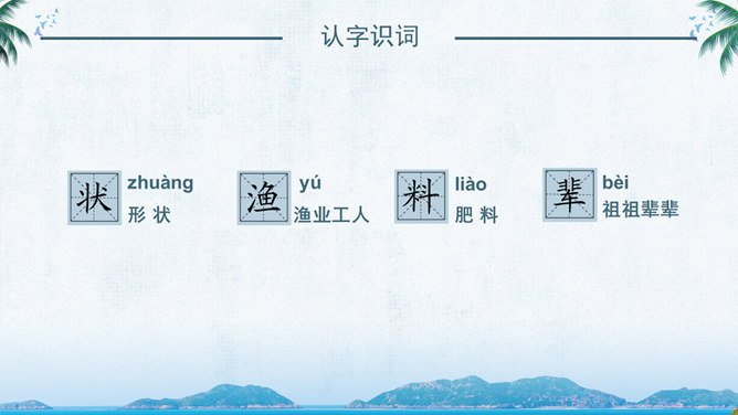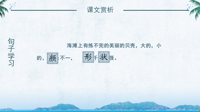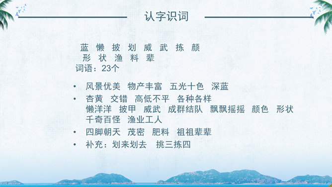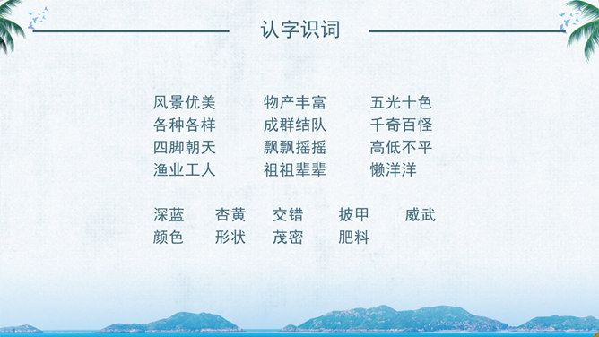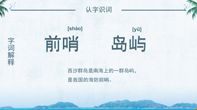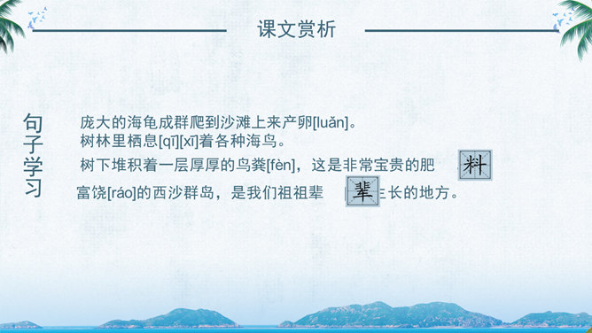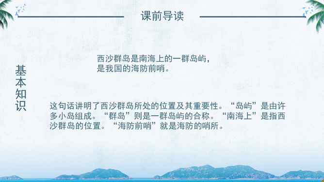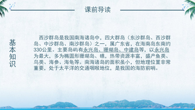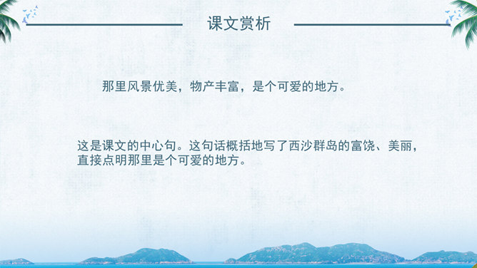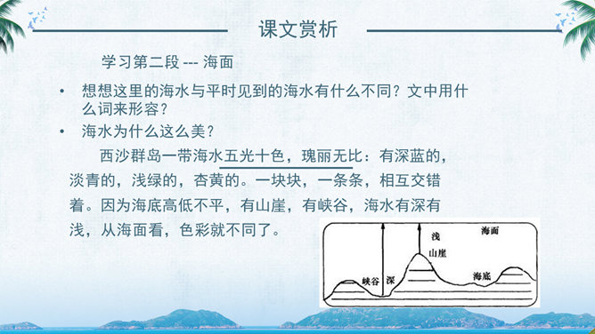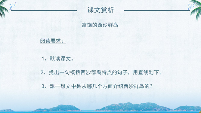 西沙群岛是南海上的一群岛屿,是我国的海防前哨。 这句话讲明了西沙群岛所处的位置及其重要性。“岛屿”是由许多小岛组成。“群岛”则是一群岛屿的合称。“南海上”是指西沙群岛的位置。“海防前哨”就是海防的哨所。 阅读要求:1、默读课文。 2、找出一句概括西沙群岛特点的句子,用直线划下。 3、想一想文中是从哪几个方面介绍西沙群岛的? 那里风景优美,物产丰富,是个可爱的地方。 这是课文的中心句。这句话概括地写了西沙群岛的富饶、美丽,直接点明那里是个可爱的地方。 想想这里的海水与平时见到的海水有什么不同?文中用什么词来形容?海水为什么这么美?默读3自然段,边读边想这一段主要讲了什么?在文中圈出来。