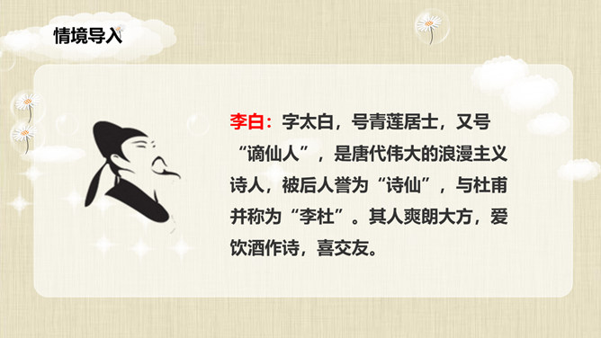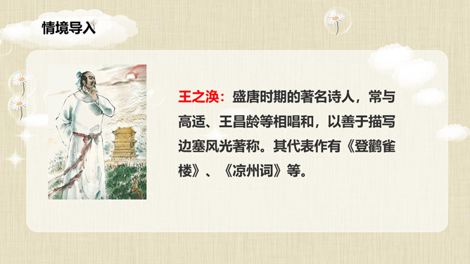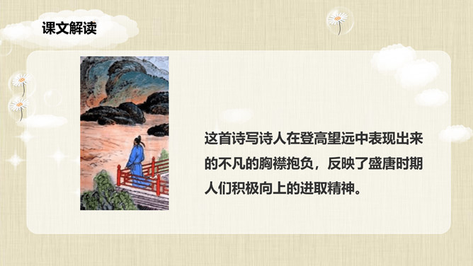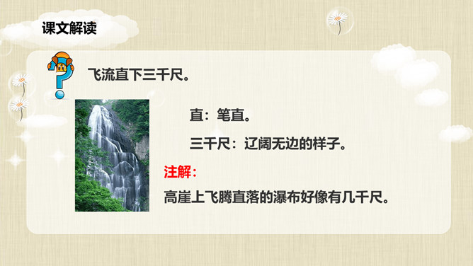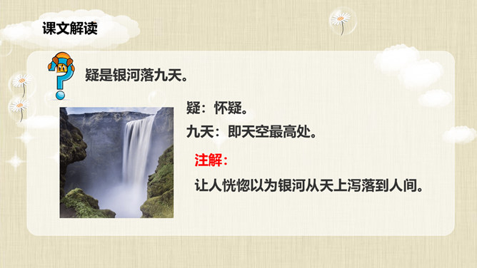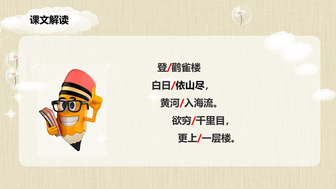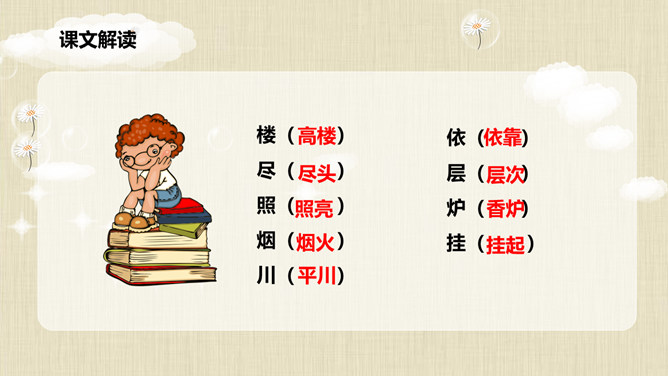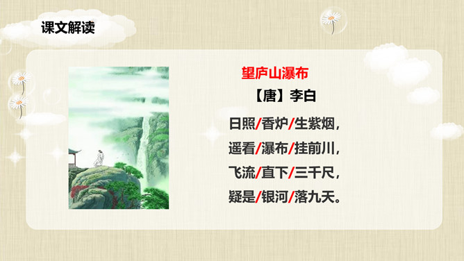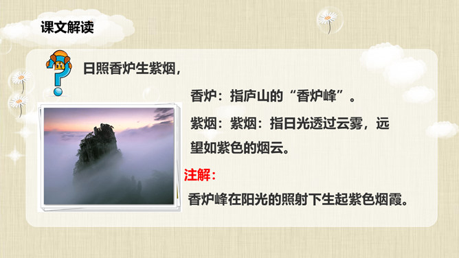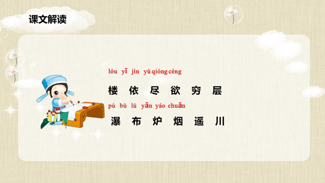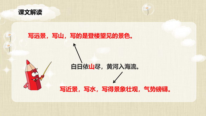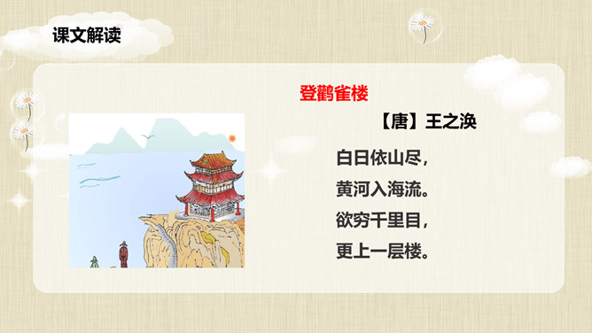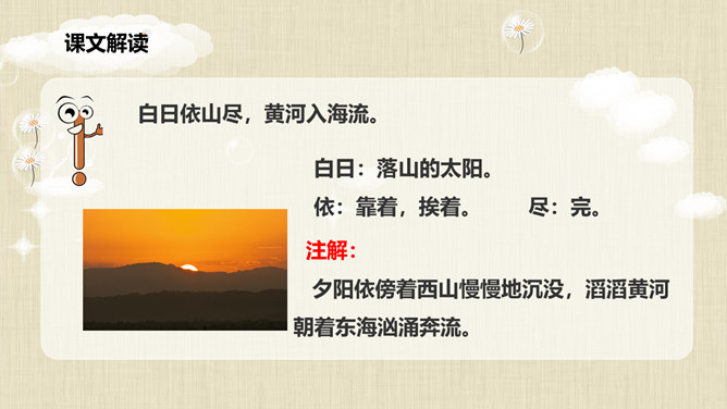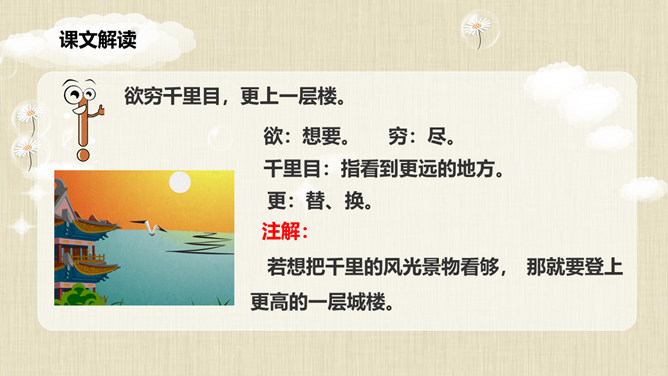 白日依山尽,黄河入海流。白日:落山的太阳。依:靠着,挨着。尽:完。注解:夕阳依傍着西山慢慢地沉没,滔滔黄河朝着东海汹涌奔流。写远景,写山,写的是登楼望见的景色。写近景,写水,写得景象壮观,气势磅礴。欲穷千里目,更上一层楼。欲:想要。穷:尽。千里目:指看到更远的地方。更:替、换。注解:若想把千里的风光景物看够, 那就要登上更高的一层城楼。这首诗写诗人在登高望远中表现出来的不凡的胸襟抱负,反映了盛唐时期人们积极向上的进取精神。日照香炉生紫烟。香炉:指庐山的“香炉峰”。紫烟:指日光透过云雾,远望如紫色的烟云。注解:香炉峰在阳光的照射下生起紫色烟霞。遥看瀑布挂前川。遥看:从远处看。挂:悬挂。川:河流,这里指瀑布。注解:远远望见瀑布似白色绢绸悬挂在山前。