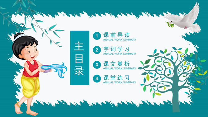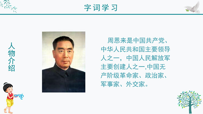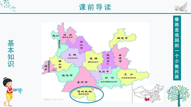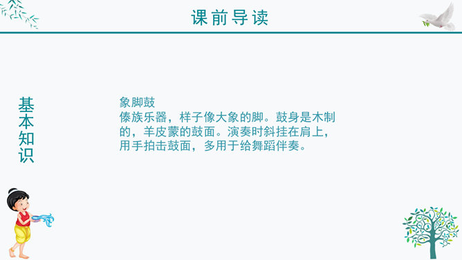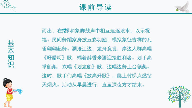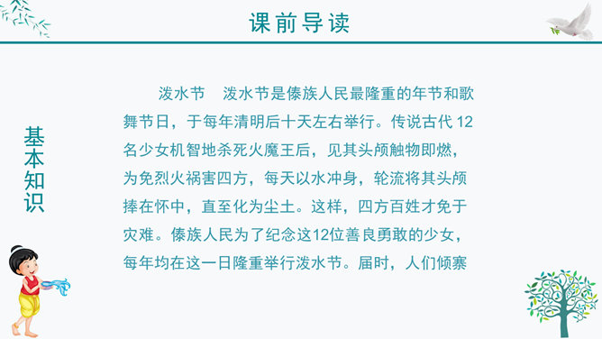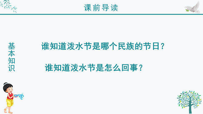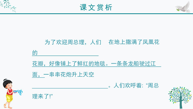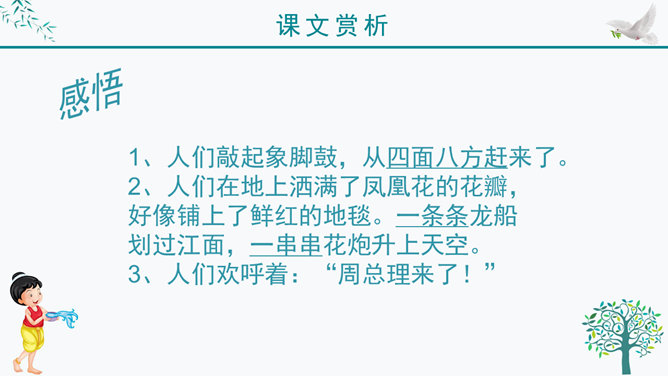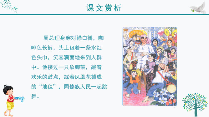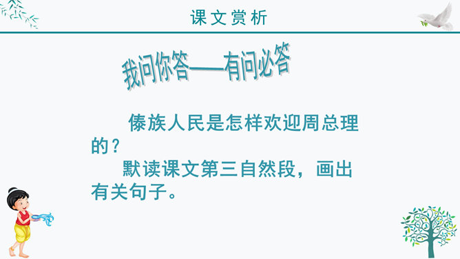 谁知道泼水节是哪个民族的节日?谁知道泼水节是怎么回事?我问你答——有问必答。傣族人民是怎样欢迎周总理的?默读课文第三自然段,画出有关句子。感悟:1、人们敲起象脚鼓,从四面八方赶来了。2、人们在地上洒满了凤凰花的花瓣,好像铺上了鲜红的地毯。一条条龙船 划过江面,一串串花炮升上天空。3、人们欢呼着:“周总理来了!”人们把最鲜红的凤凰花瓣撒在地上表示什么?周总理是怎样跟傣族人民欢度节日的?所属专题:难忘的泼水节ppt。