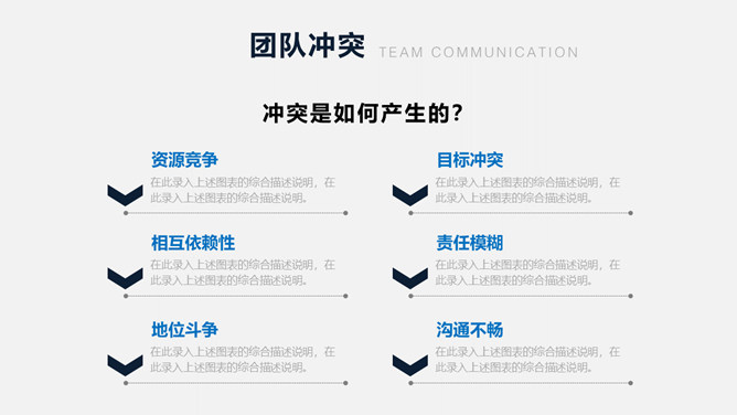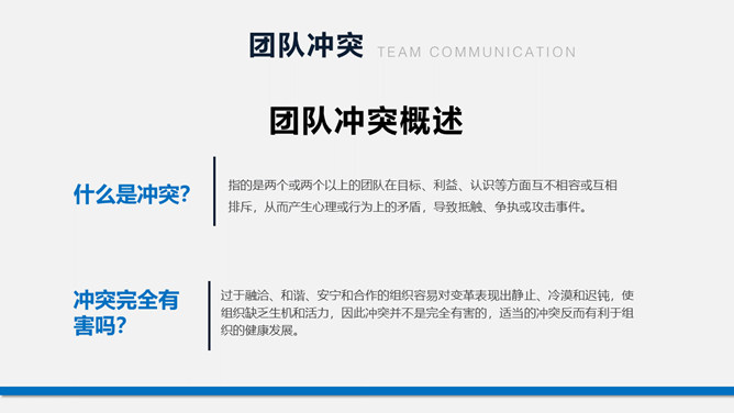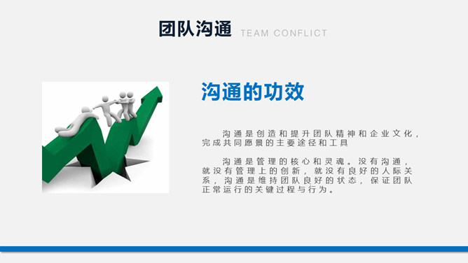 团队建设团建培训PPT模板。包括认识团队、团队激励、团队沟通、团队冲突、提升团队执行力几个部分。