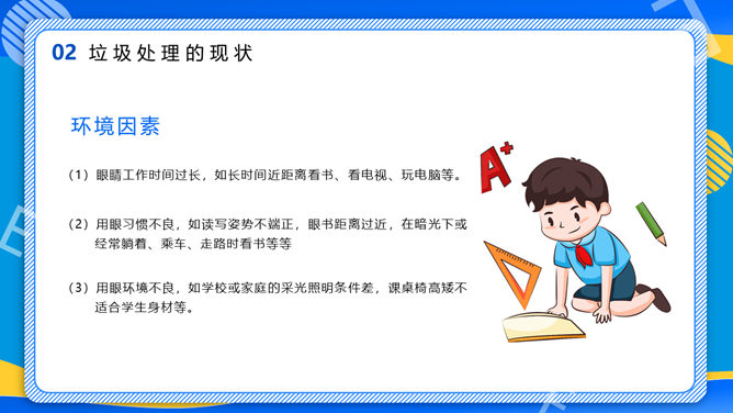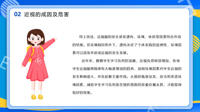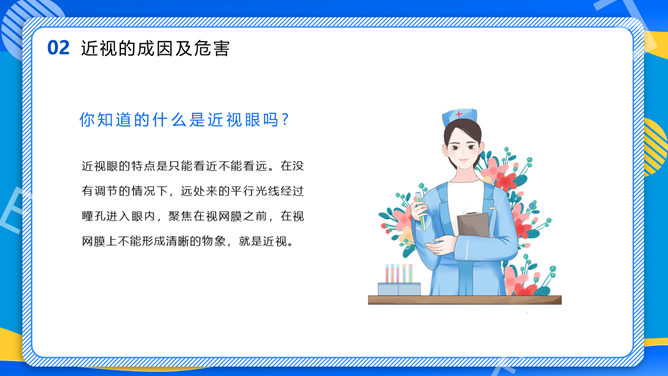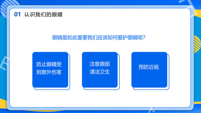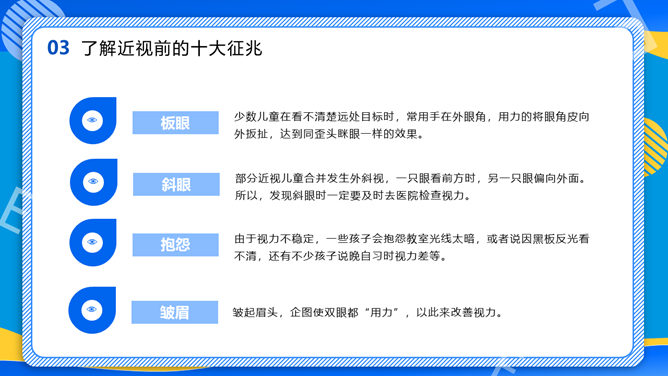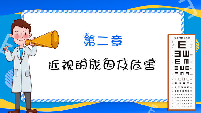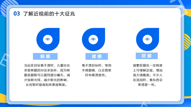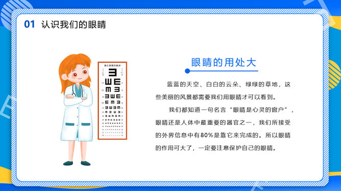 全国爱眼日护眼宣传PPT模板。一套全国爱眼日主题幻灯片模板,包括认识我们的眼睛、近视眼的成因及其危害、了解近视前的十大征兆、我们该如何预防近视、保护视力我们一起行动几个部分,适合护眼宣传内容。
