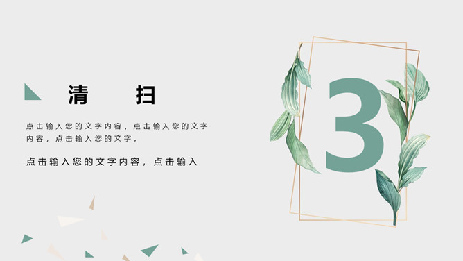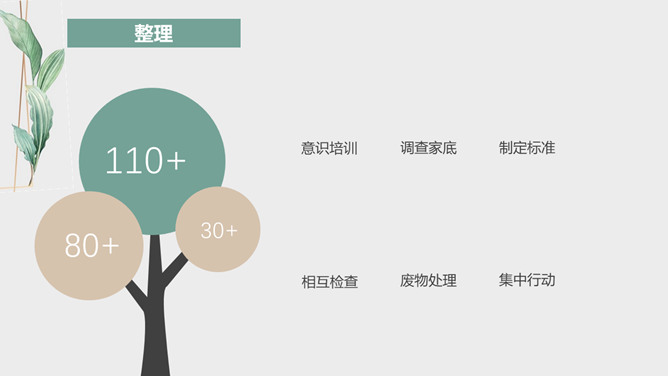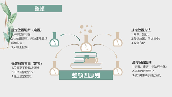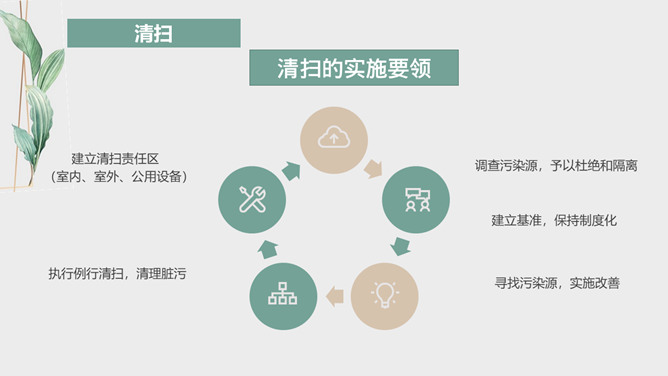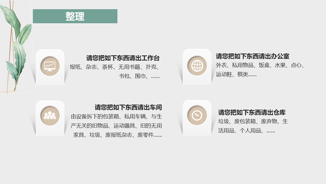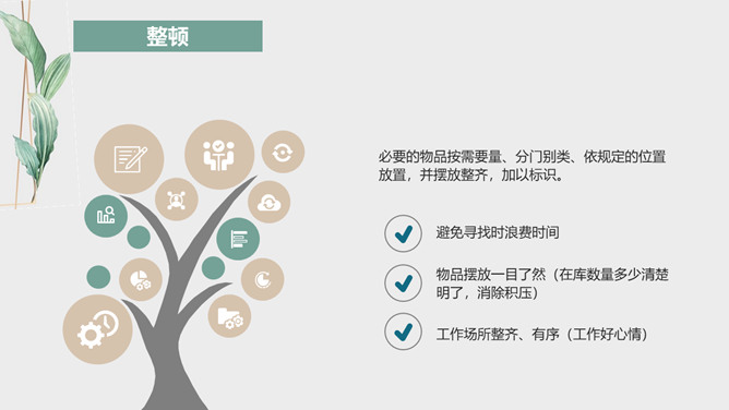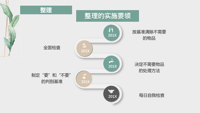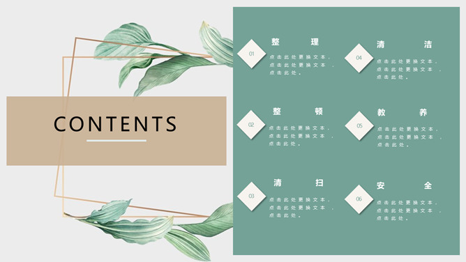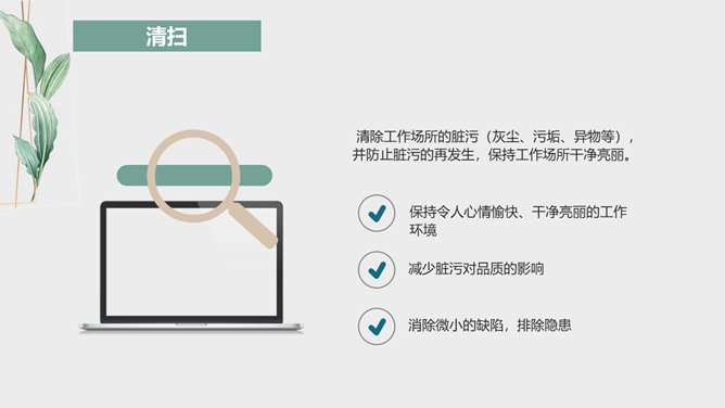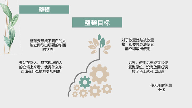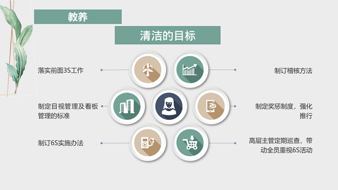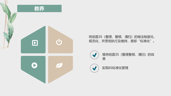 水彩叶子6S管理培训课件PPT模板。一套6S管理培训教材课件幻灯片模板,清新淡雅水彩绿叶叶子装饰。