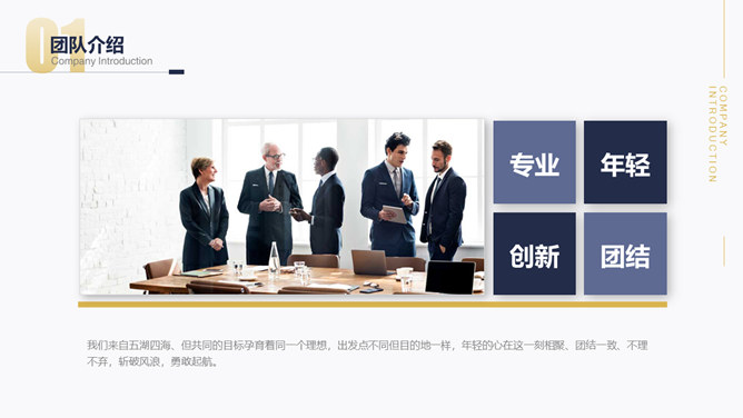 高端公司介绍简介PPT模板。一套公司简介介绍幻灯片模板,高端大气,页面类型丰富实用,好看的动态效果。