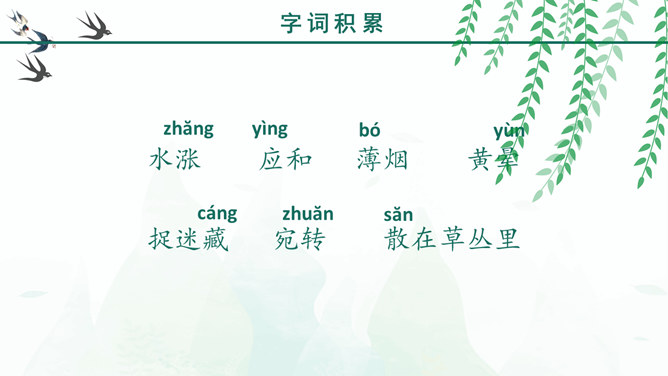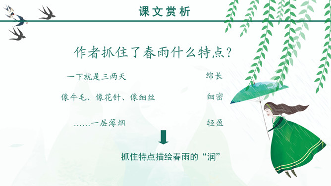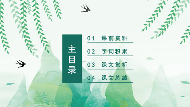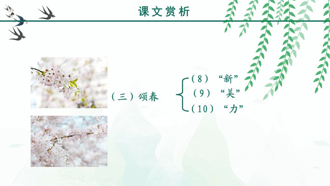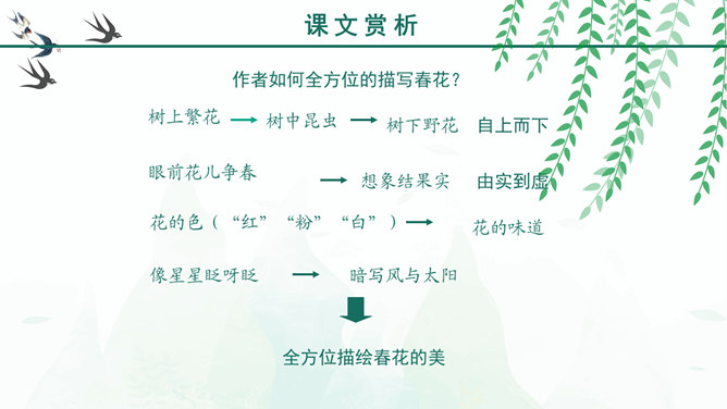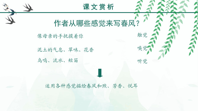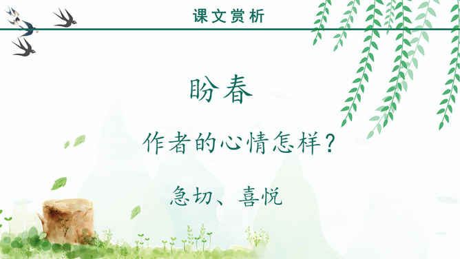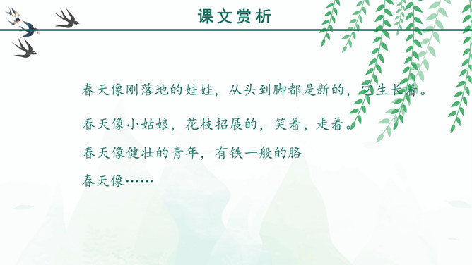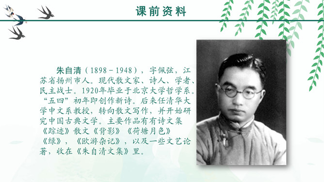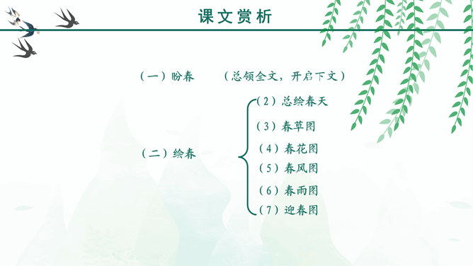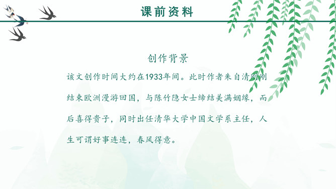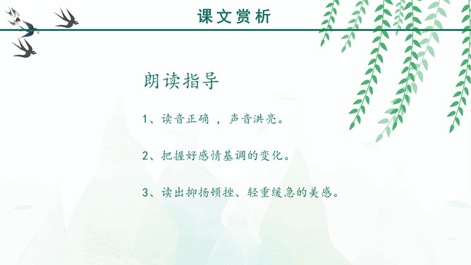 朗读指导:1、读音正确 ,声音洪亮。2、把握好感情基调的变化。3、读出抑扬顿挫、轻重缓急的美感。这篇优美的写景抒情散文抓住春景的特点,描绘了大地春回、生机勃发的动人景象,赞美春的活力带给人以希望和力量,激励人们抓紧春光努力工作,奋发向上。写作特色:1、观察细致,特征突出。2、结构严谨,顺序明晰。3、语言生动,流畅优美。4、诗情画意,情景交融。该文创作时间大约在1933年间。此时作者朱自清刚刚结束欧洲漫游回国,与陈竹隐女士缔结美满姻缘,而后喜得贵子,同时出任清华大学中国文学系主任,人生可谓好事连连,春风得意。《春》是现代散文家朱自清的作品。《春》是朱自清的散文名篇,最初发表于1933年7月,此后长期被中国中学语文教材选用。在该篇“贮满诗意”的“春的赞歌”中,事实上饱含了作家特定时期的思想情绪、对人生及至人格的追求。所属专题:春ppt。