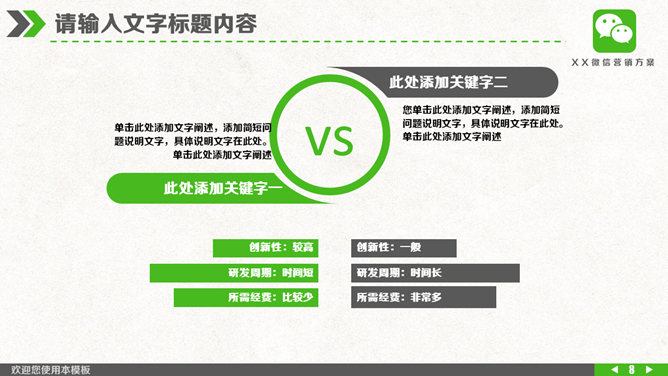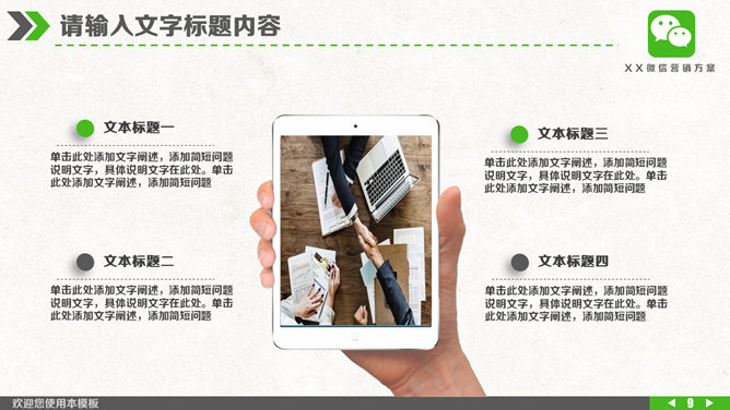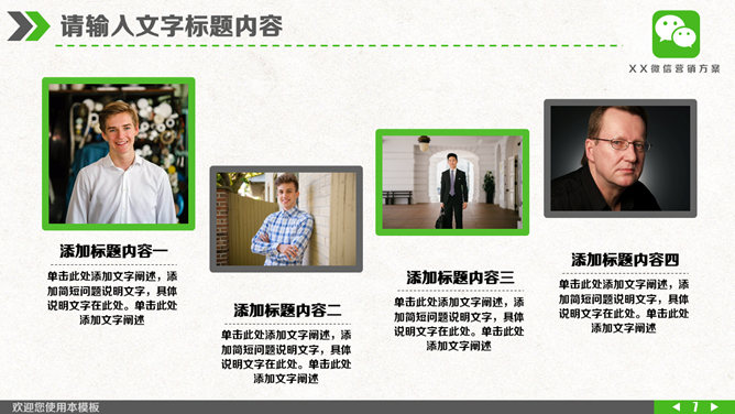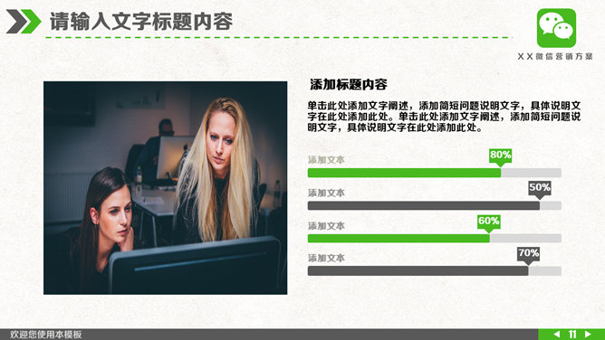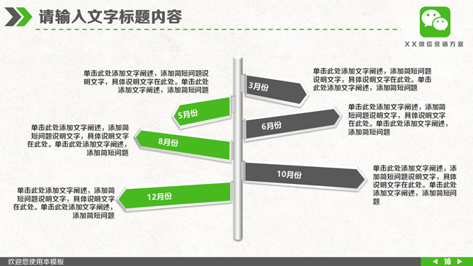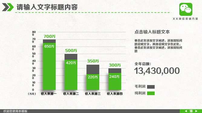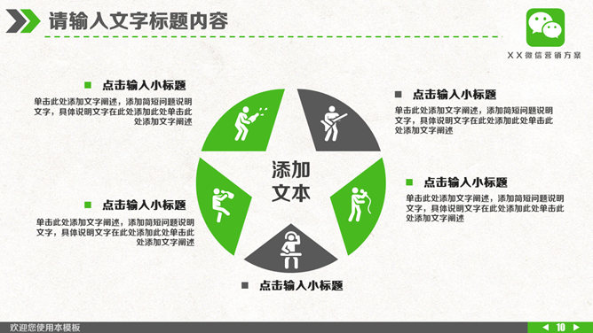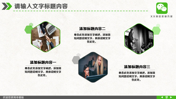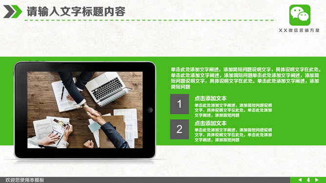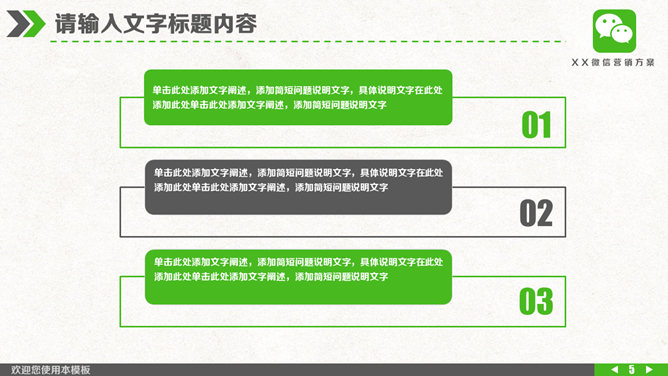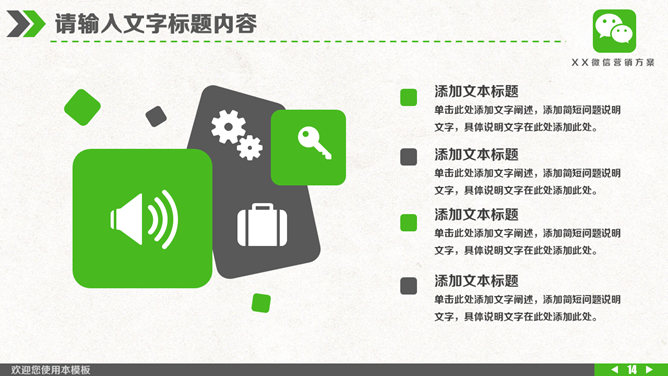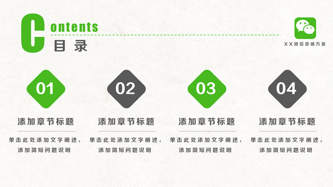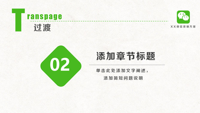 微信营销解决方案PPT模板。一套微信营销方案幻灯片模板,微信主题绿色主色调,页面类型丰富实用。