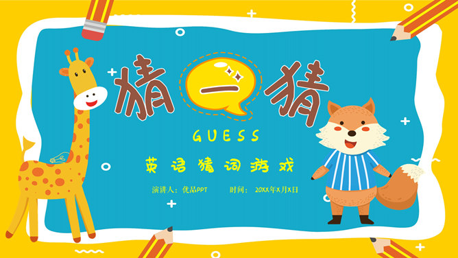 英语猜词游戏PPT模板。一套英语猜词游戏课件幻灯片模板,可爱卡通设计风格,小动物背景,动态播放。
