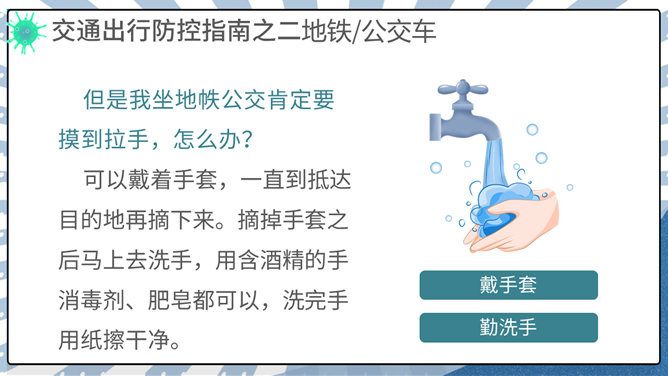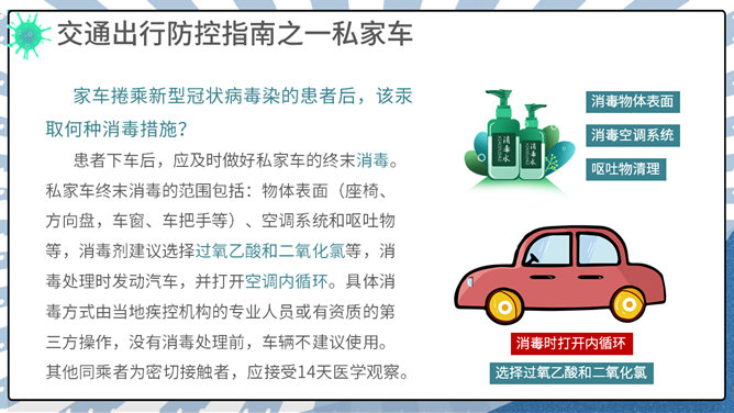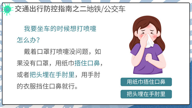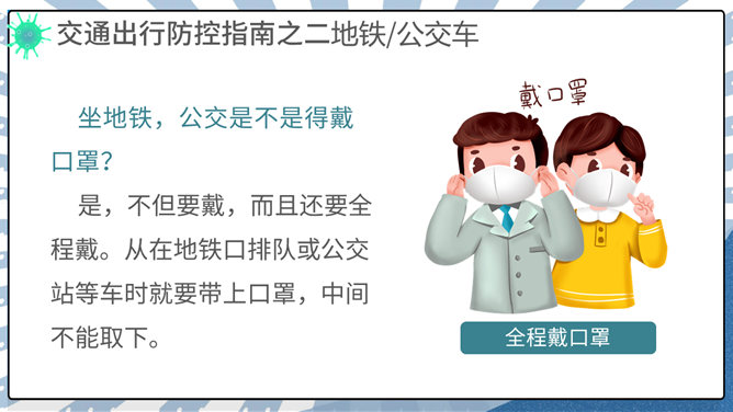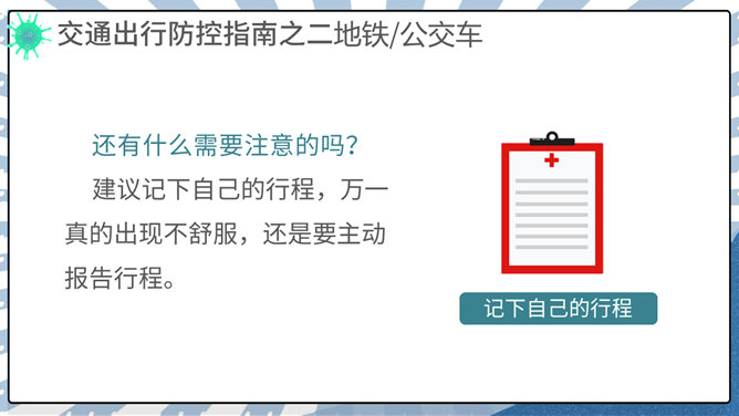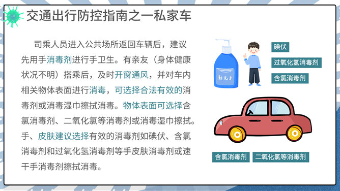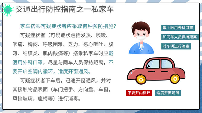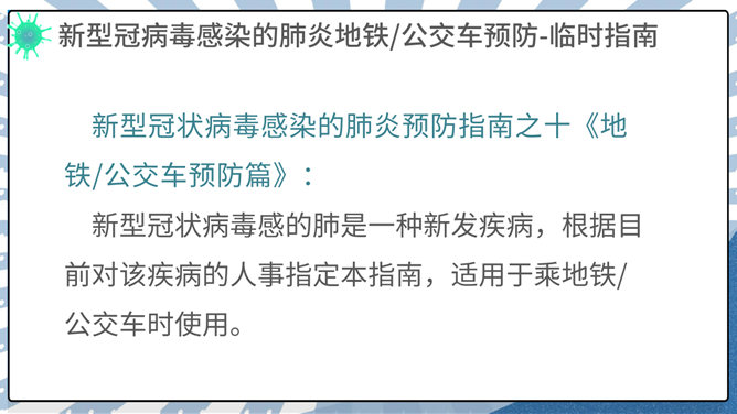 新型冠状病毒肺炎之交通出行防控指南。包括私家车、地铁/公交车、火车/高铁/动车等不同交通工具的防控措施。