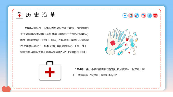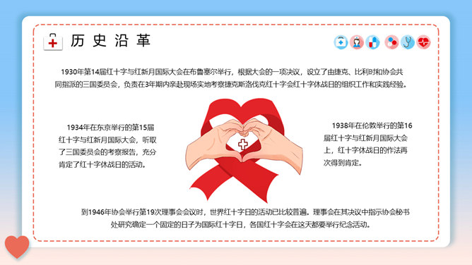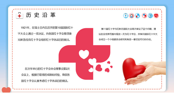 世界红十字日介绍PPT模板。一套世界红十字日宣传介绍幻灯片模板,介绍了历史沿革、历年主题等内容。