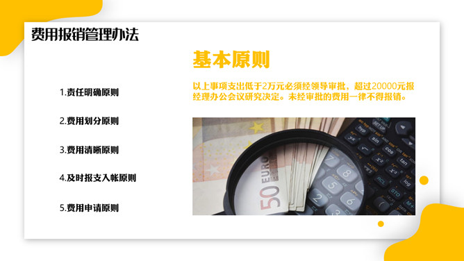 财务报销流程培训PPT模板。一、费用报销管理办法。二、业务招待费报销。三、差旅费报销。四、报销流程培训。