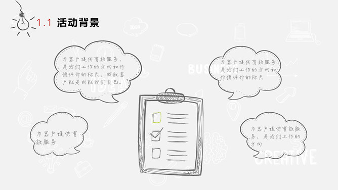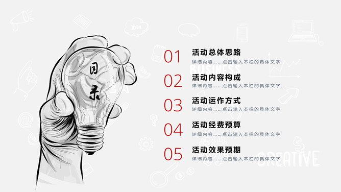 创意手绘风活动策划PPT模板。一套活动策划方案幻灯片模板,素雅黑灰配色,创意手绘设计风格,动态播放。