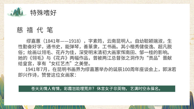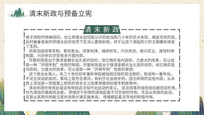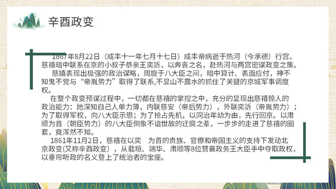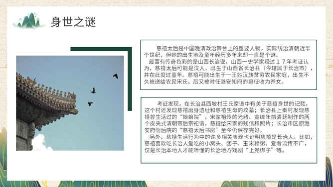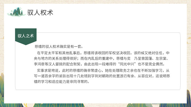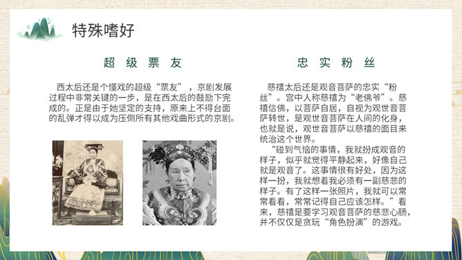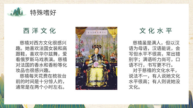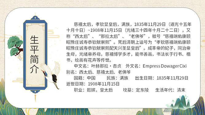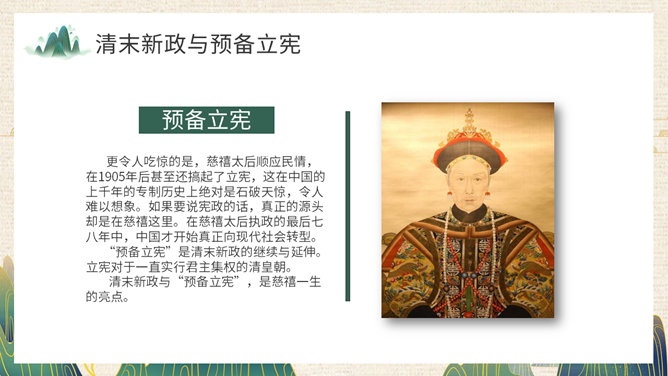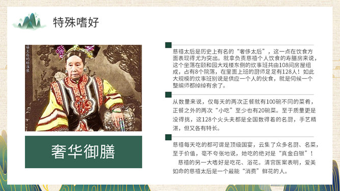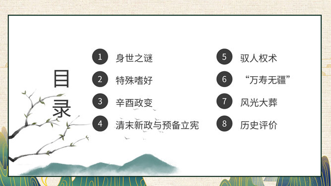 历史人物慈禧生平介绍PPT模板。介绍了慈禧的身世之谜、特殊嗜好、辛酉政变、清末新政与预备立宪、驭人权术、“万寿无疆”、风光大葬、历史评价等内容。