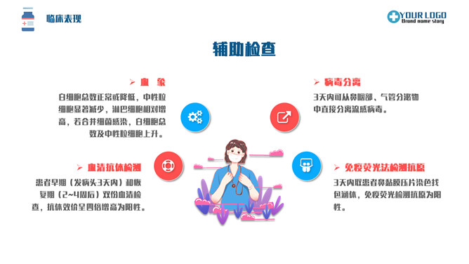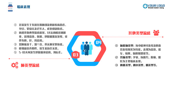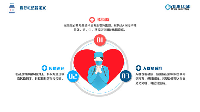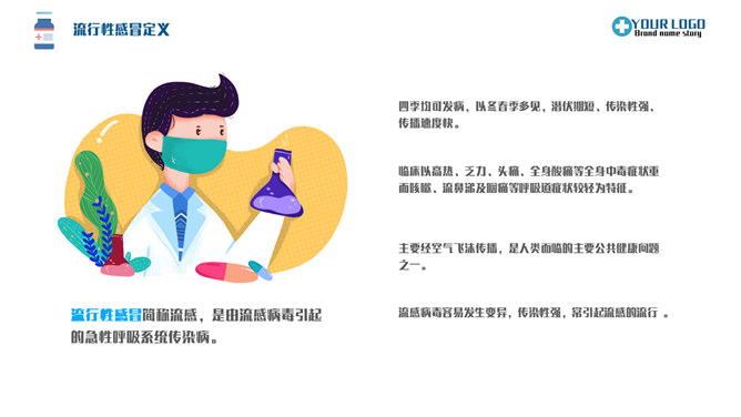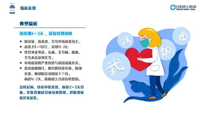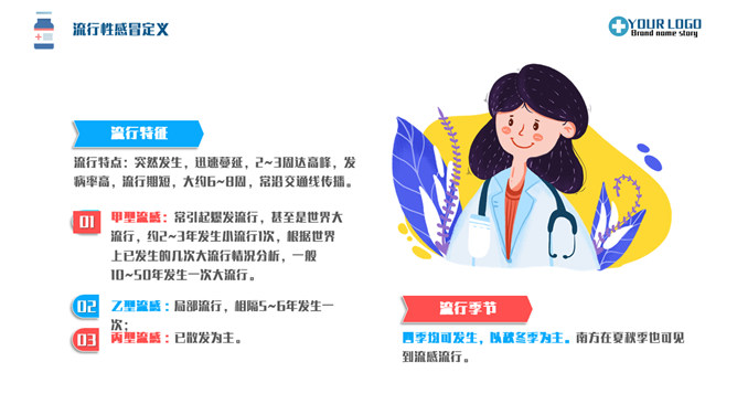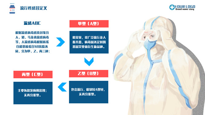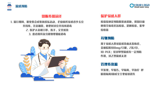 流感预防与护理PPT模板。介绍了包括流感简介、临床表现、流感预防、流感疫苗、流感饮食几个部分。