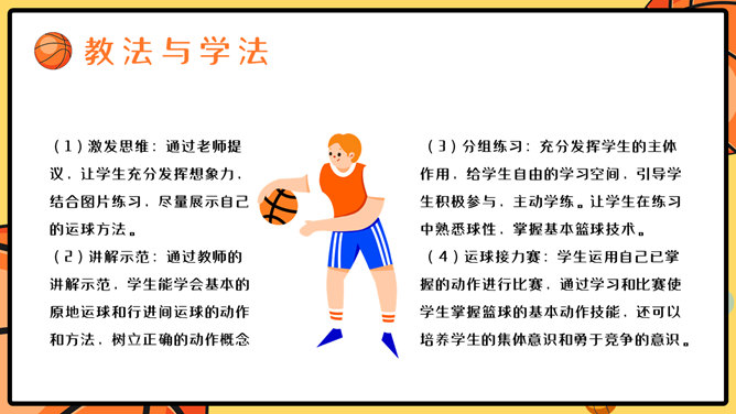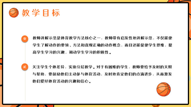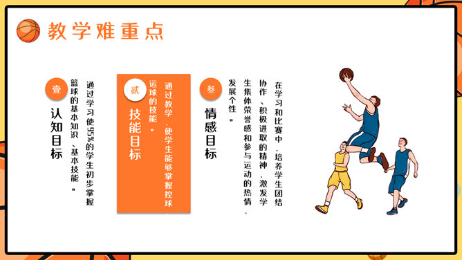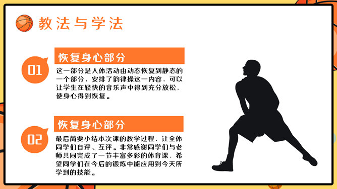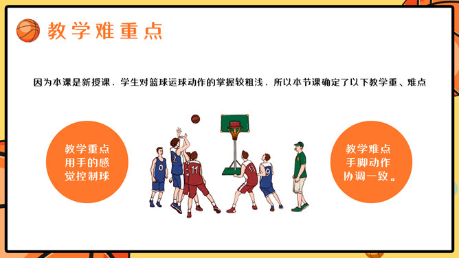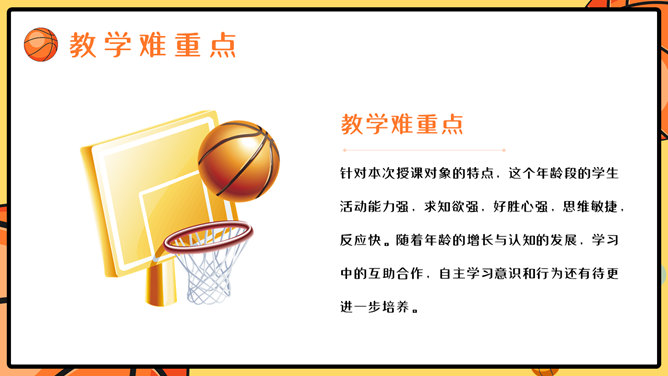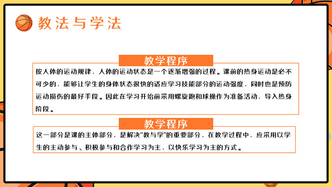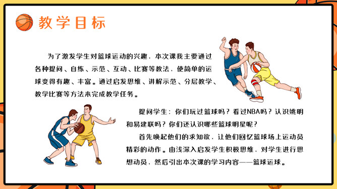 篮球体育课教学说课PPT模板。一套篮球运动主题幻灯片模板,适合制作体育课篮球课说课课件使用。